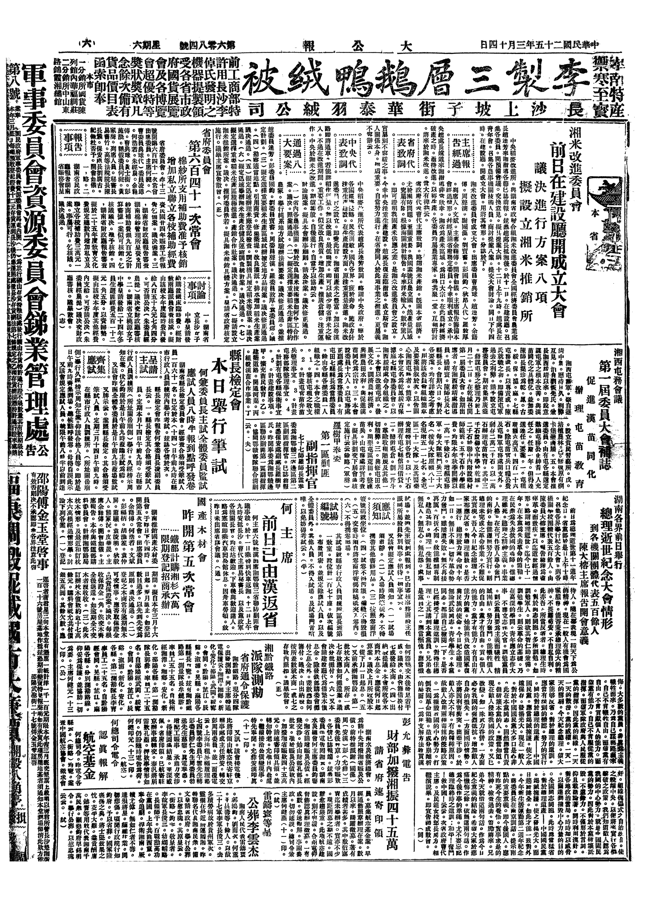 △ 全国县政讨论会在南京开幕,行政院政务处长蒋廷黻主席,讨论县行政及与上级政府之关系、省县间关系调整、地方财政之整理、县政人才培育、行政督察专员制度设立、土地陈报之推行及征收制度之改善等问题。