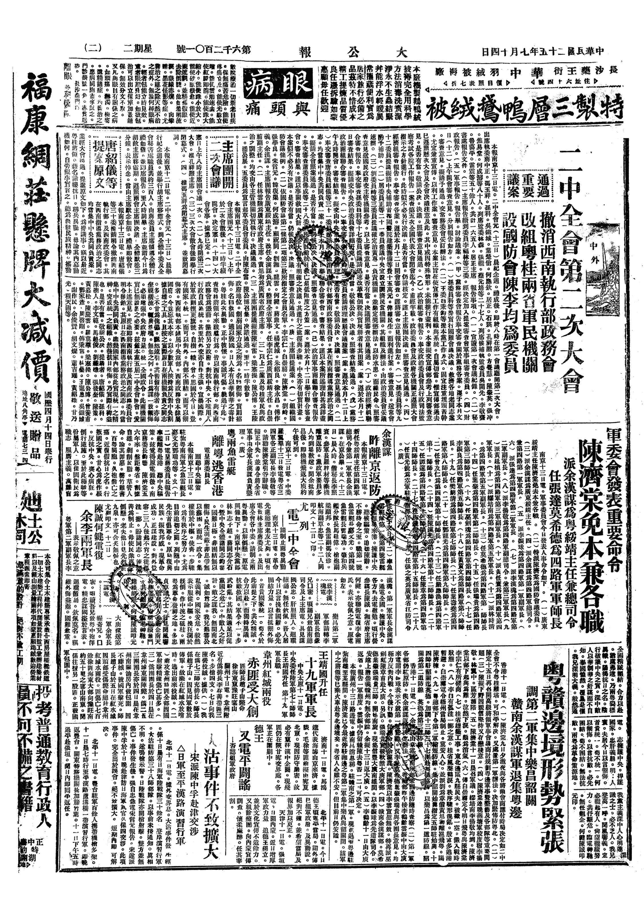 丙、广东绥靖主任余汉谋在大庾就职,并电促陈济棠入京。第2军团长三人通电脱离陈济棠。