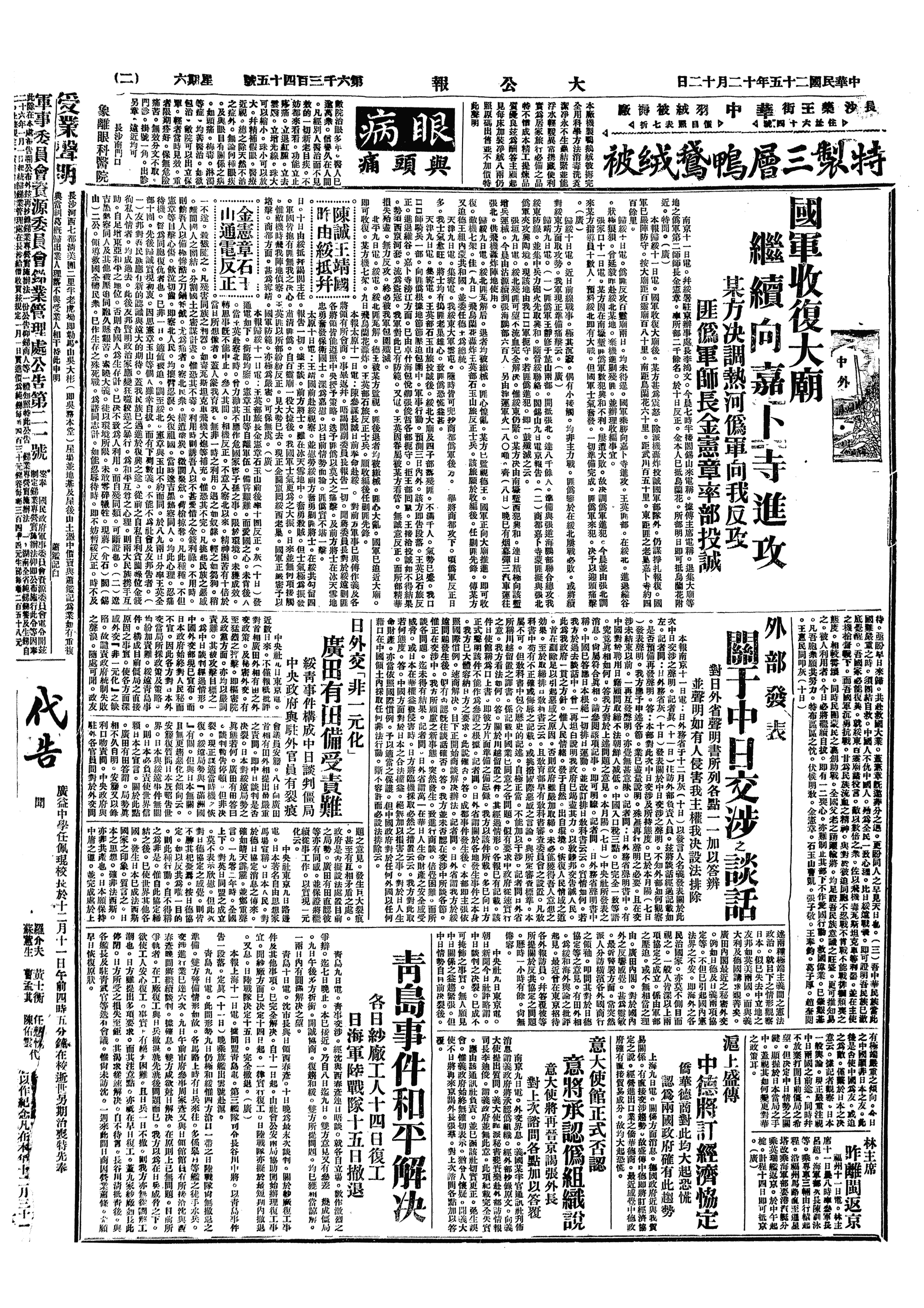 △ 北平举行援绥抗日大会,会后学生示威游行,高呼“庆祝收复大庙”、“援助绥远抗战”、“争取爱国自由,释放救国领袖”、“反对青岛屈服协定”、“各党派联合起来一致抗日”等口号,并提出要求冀察当局出兵冀东,收复察北。