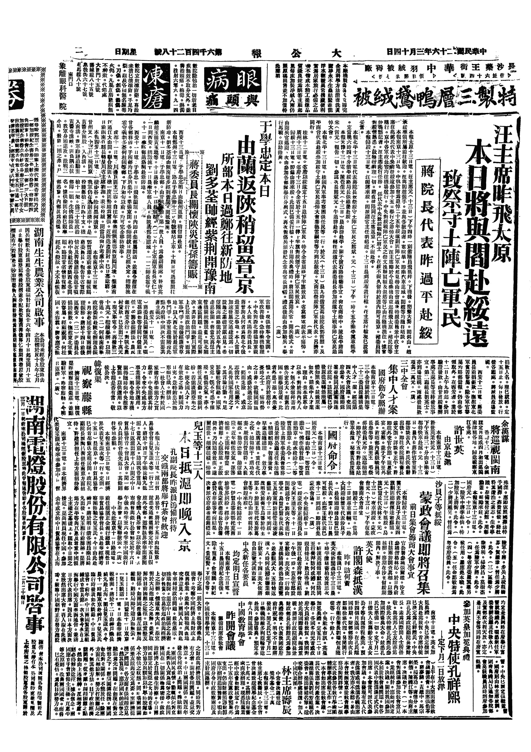 △ 汪精卫在太原各界欢迎会上演讲,称对内求自立、对外求共存,是一切工作的重心,与安内攘外是一件事。
