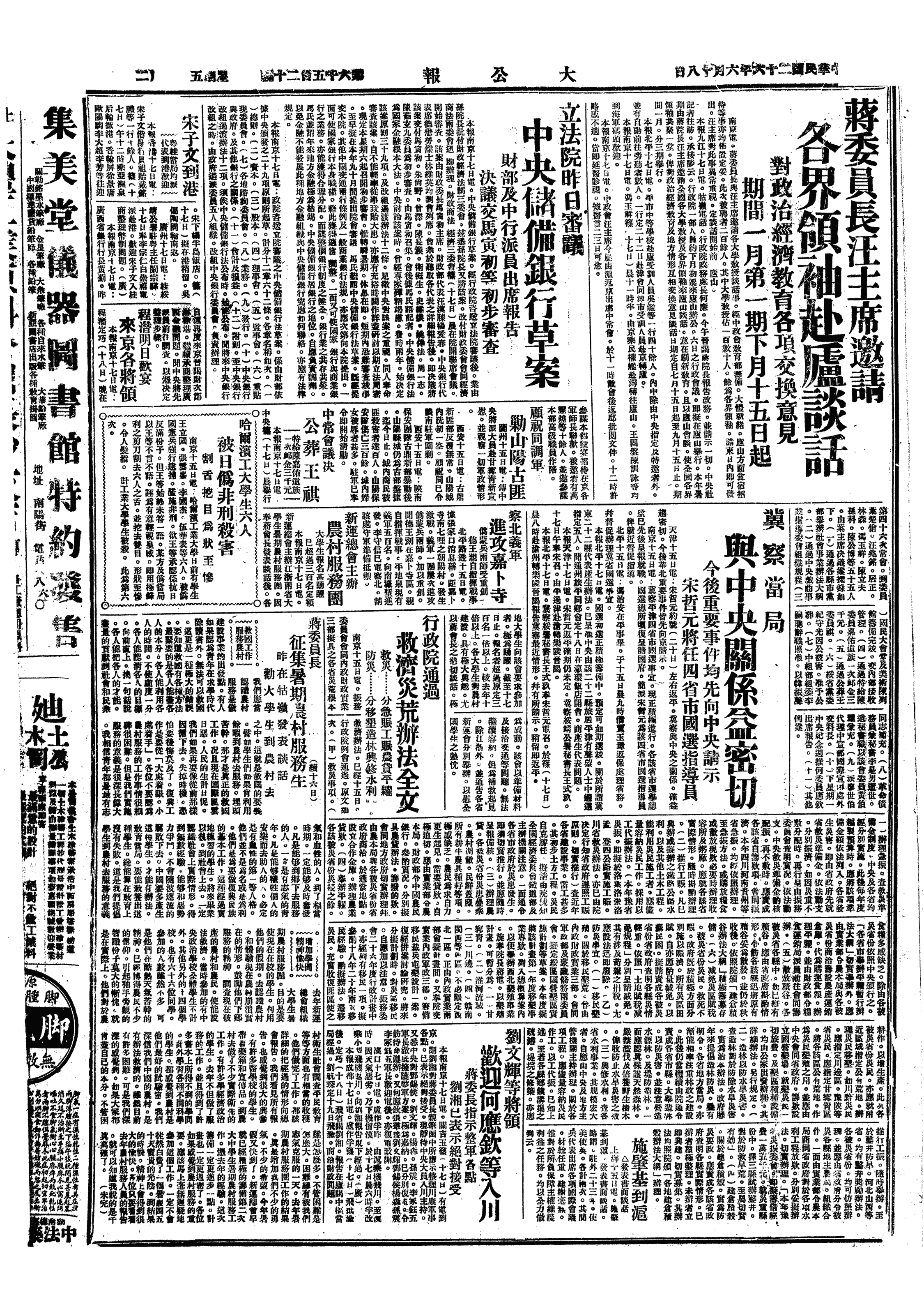偕逸樵及乔年至寓中膳。二点至所。作函 数通,一致卢作孚,为四川建立省会测候所事。六点与古洛丁谈十分钟。至六点一刻赴广播电台演讲“气象浅说”第四讲。七点回。丁炜文来。又自称前冯庸大学英文教员黄君来。周慧明等来。八点膳。十点乘车别侠至下关,坐20号卧铺。