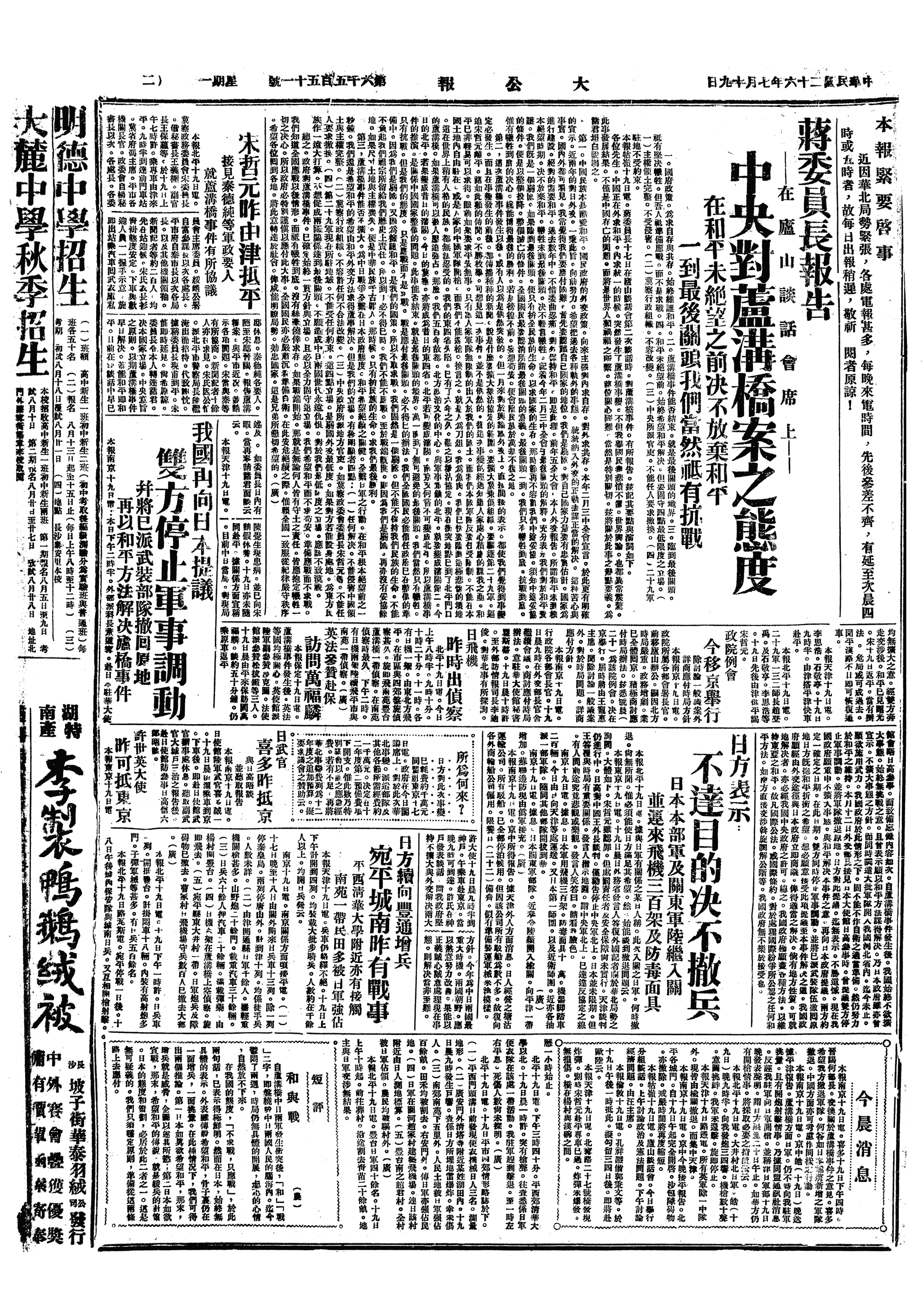 此次卢沟桥事件之发生,均非中日两大民族之所愿,盖可断言。