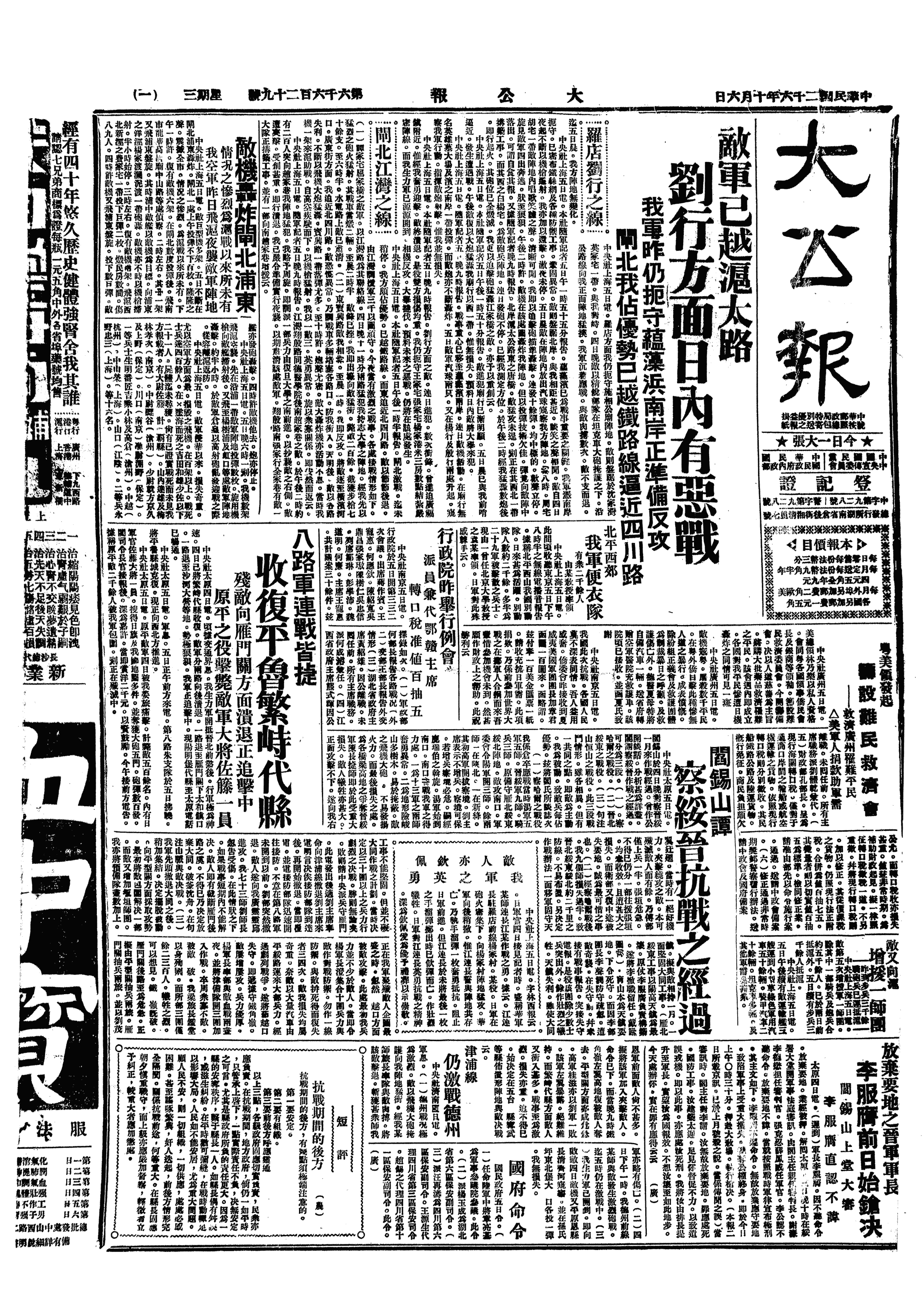 沪敌集中兵力,沿罗店、浏河进攻,图直取嘉定,庙行方面亦有激烈阵地战。