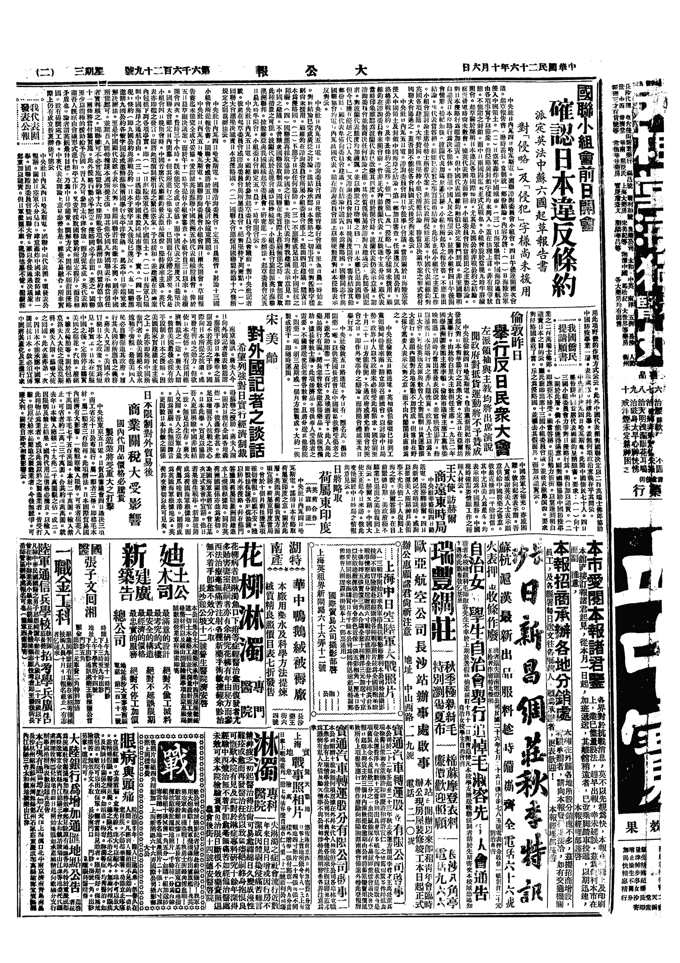 △ 国联大会通过远东顾问委员会提出之两报告: