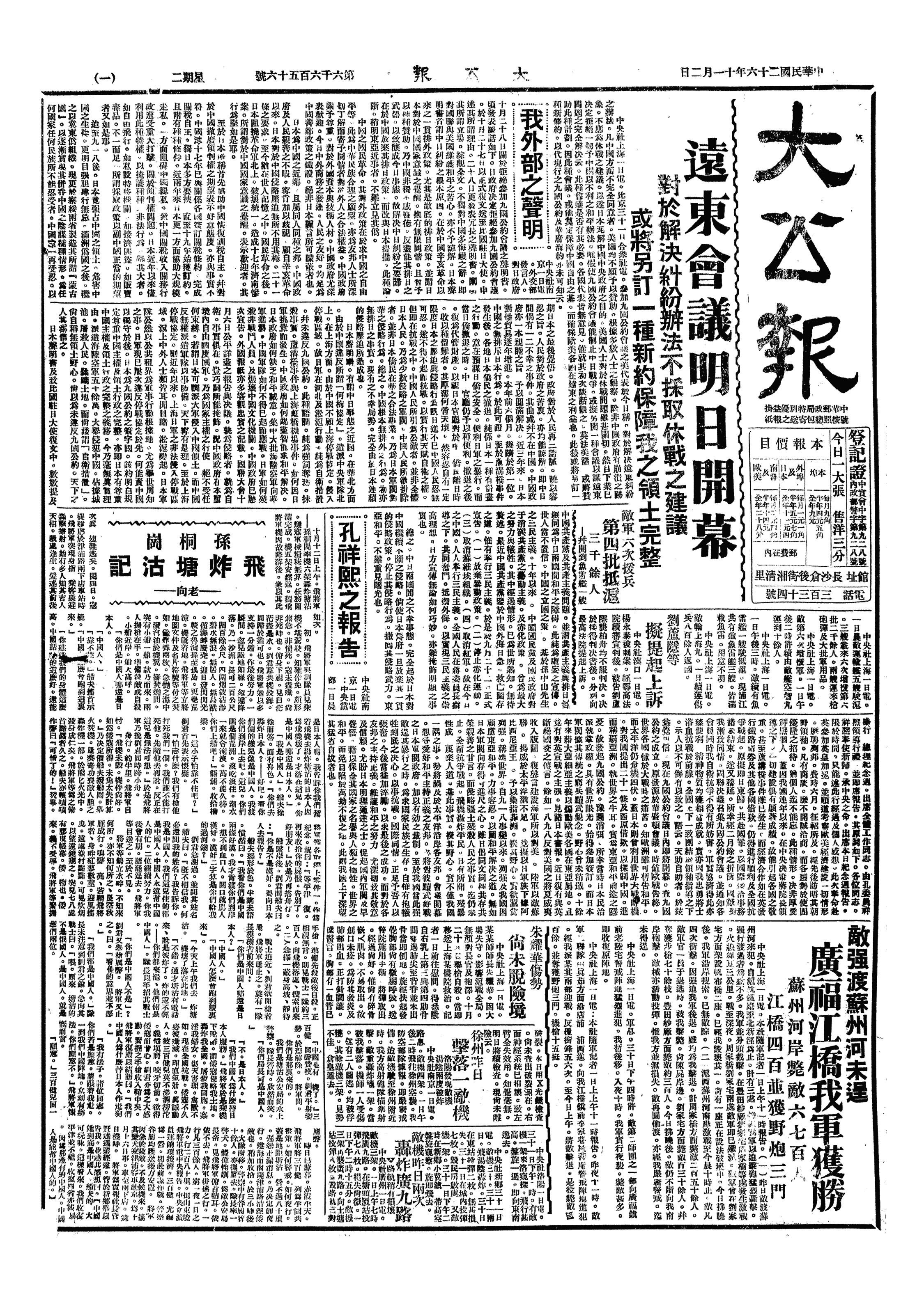 △ 中央研究院院长蔡元培及国立北京大学校长蒋梦麟、国立中央大学校长罗家伦、国立清华大学校长梅贻琦等电九国公约会议,呼吁阻止日本侵华,膺惩日本摧毁各大学及其他文化中心罪行。