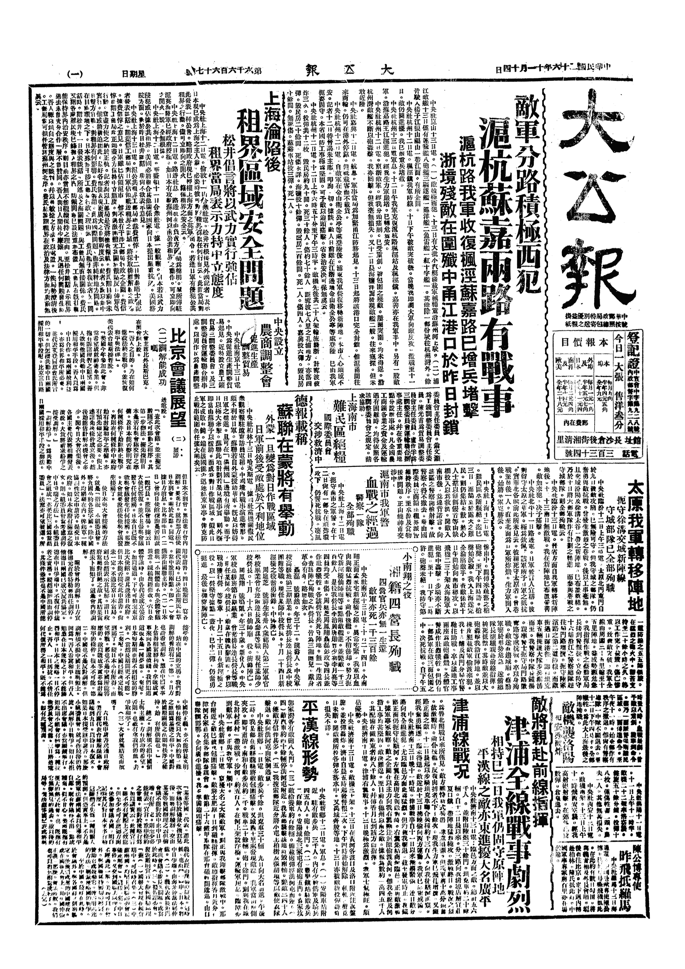 上海方面我军撤退后,敌军已进占嘉定、太仓、安定、嘉善等处,声称即将攻破我第1道国防线(一般称为中国之兴登堡线;似即自狼山、福山沿常熟、苏州至嘉兴之线)。
