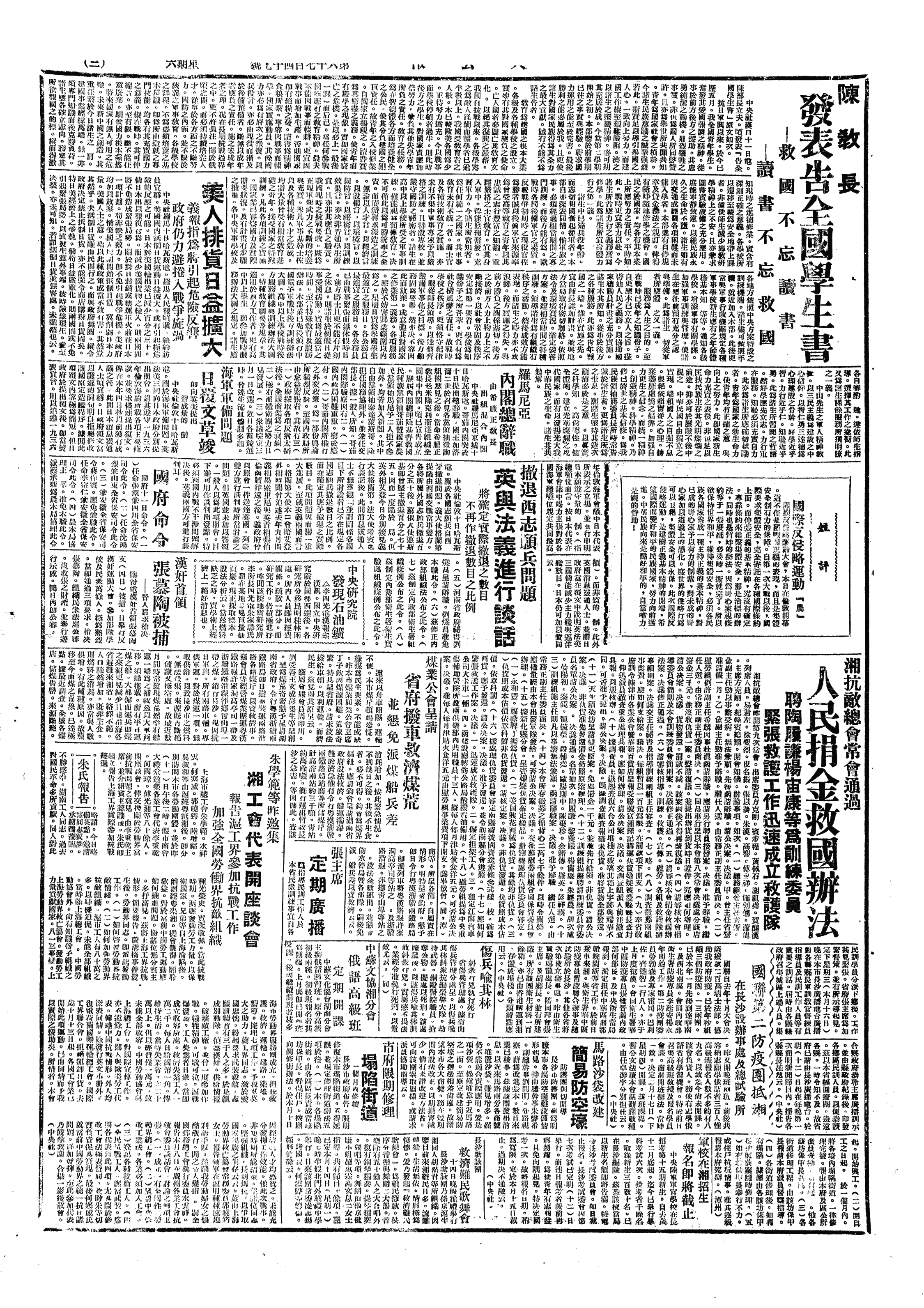 △ 全国战时教育学会在汉口成立,选举张申府等19人为理事,通过宣言及会章,决议设重庆、西安、长沙、广州等分会,并通过《全国战时教育实施要则》,凡19条,提供政府采纳。