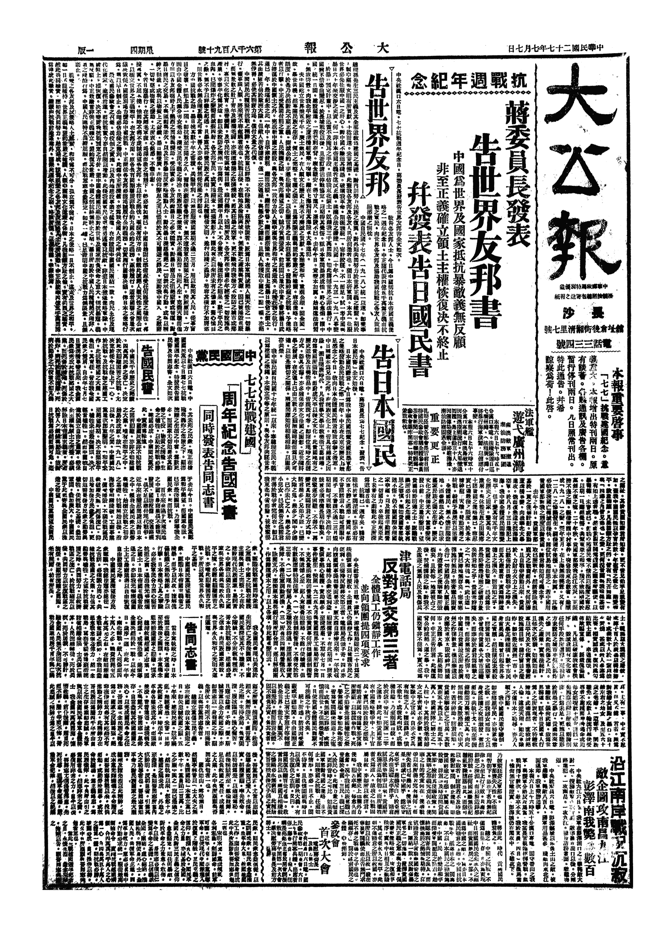 甲、今日为抗战建国周年纪念,蒋委员长发表告世界友邦书、告日本国民书,并向全国军民广播,宣布日阀罪状,声明抗战决心。国民党发表告国民书、告同志书。