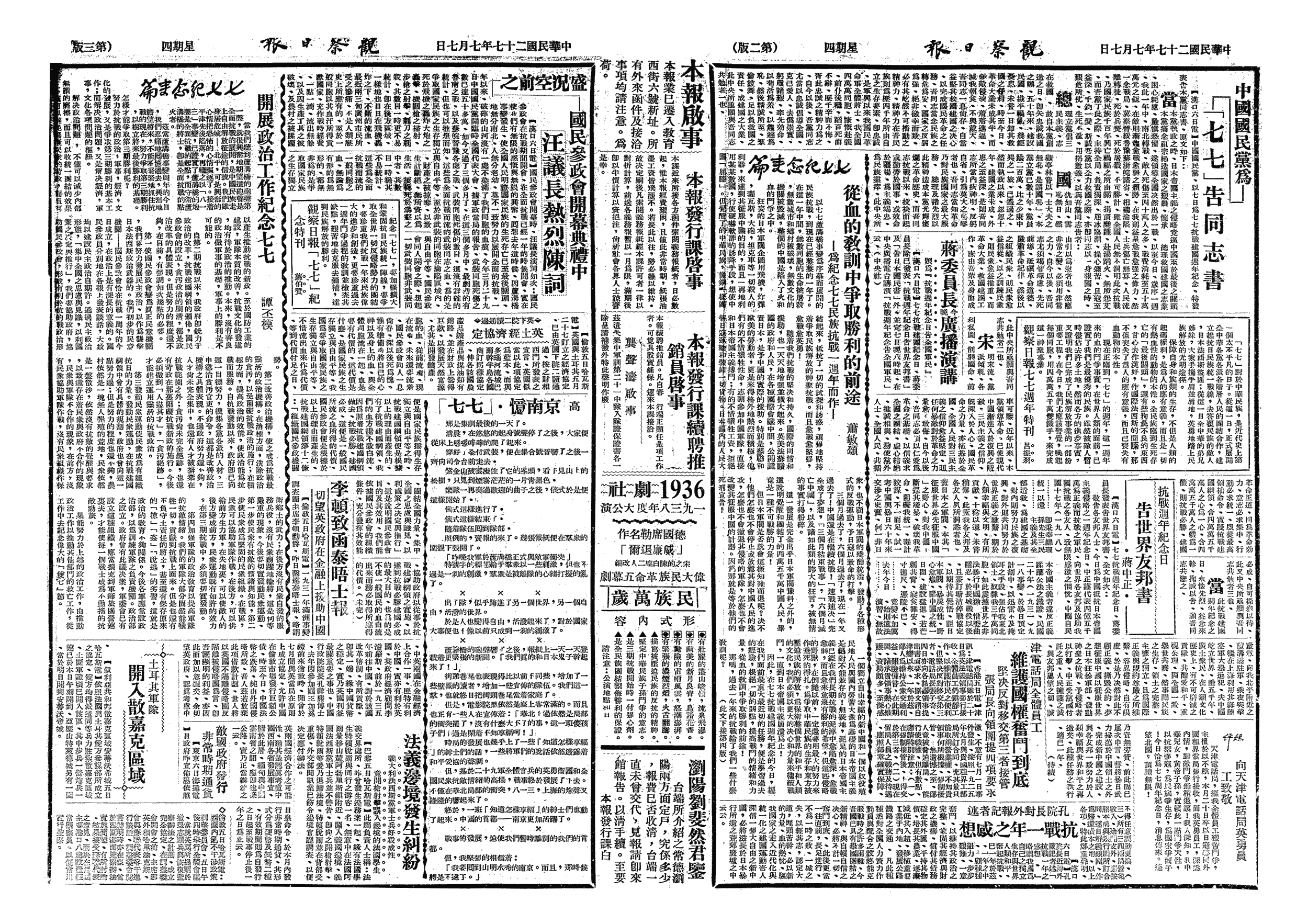 △ 国民党为“七七”抗战周年纪念发表《告国民书》及《告本党同志书》,号召战区民众对于日寇及傀儡组织予以反攻和打击;