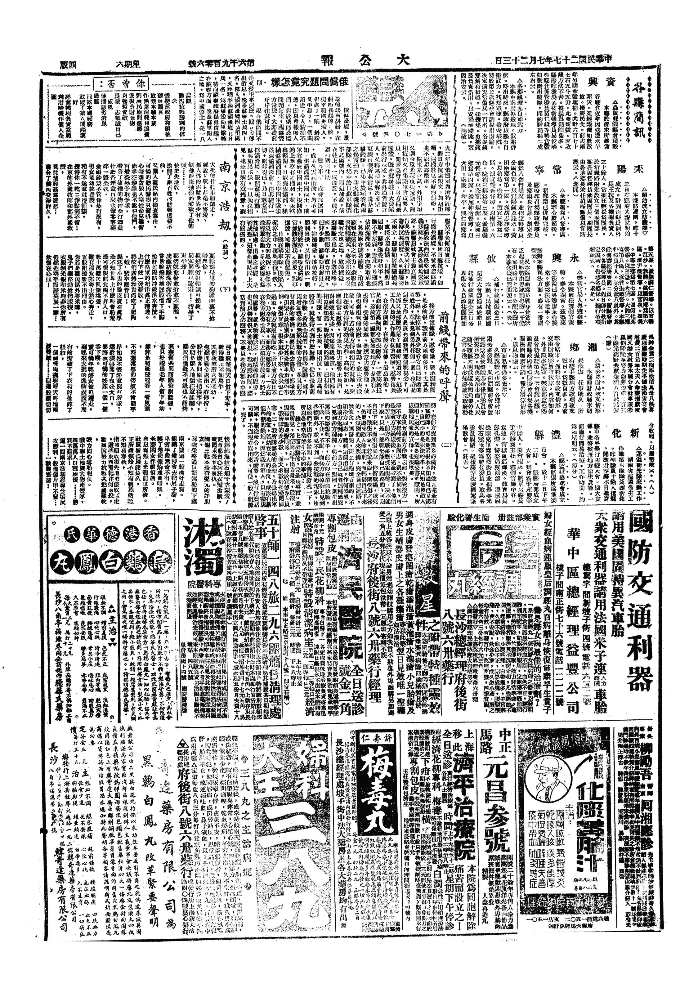 上午在科。下午赴大公报馆登广告,计费八元。赴清芬二马路,买总理纪念币二角一角各一,香港二角一枚,共一元二角。至老乡亲包子铺吃包子,遇杜甲君略谈。至全国文艺界抗敌协会,取来《抗战文艺》四册。至新泰安栈访郧仲廉,彼由此人川,即约其至三教咖啡馆饮冰。归寝已夜二时。