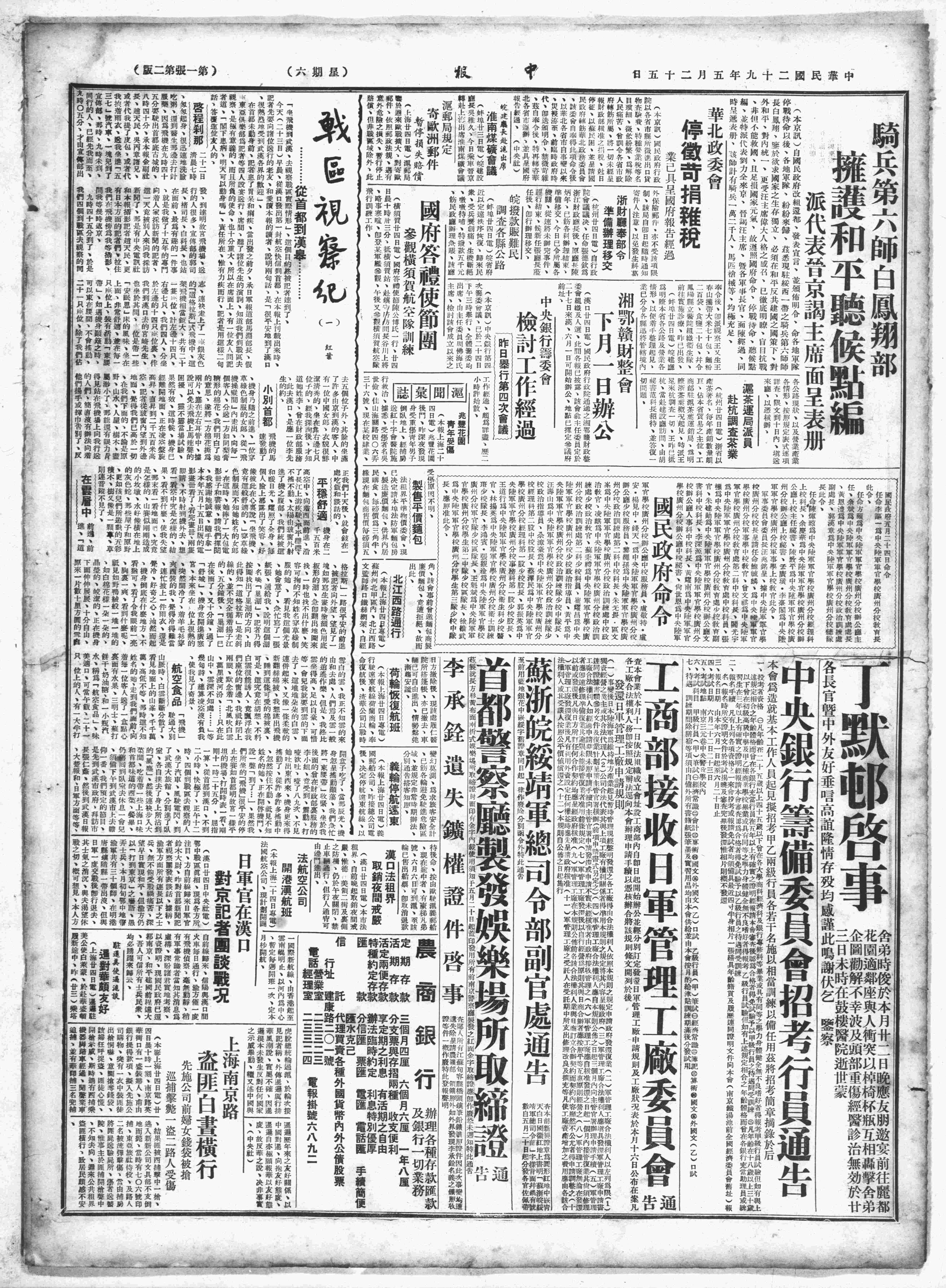 △ 国民党中央、国民政府严饬所属各机关切实组织服务队,参加反空袭服务。