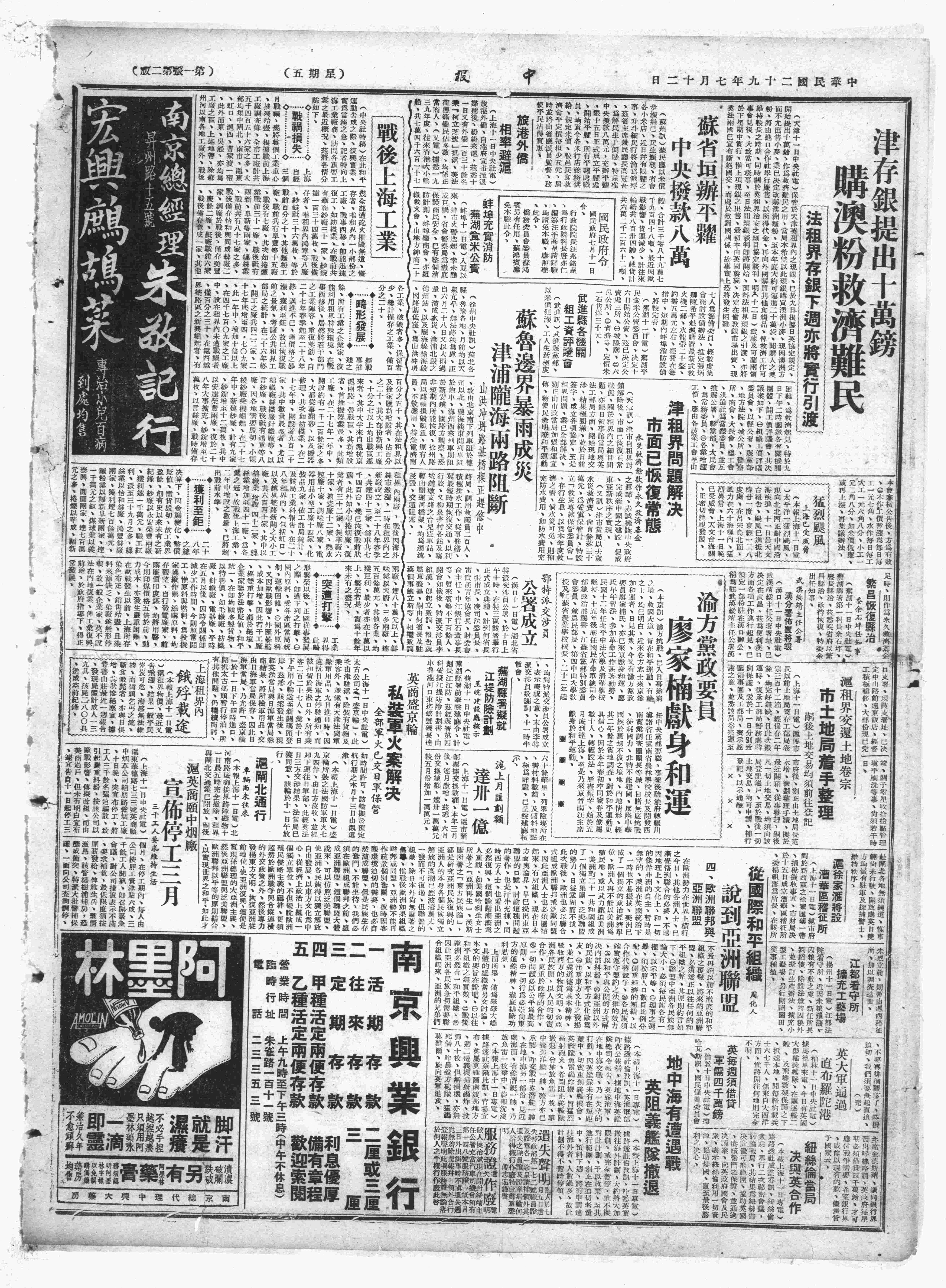 △ 上海煤气公司工人千余名及虹口区一日营公司工人200余人实行罢工,要求增加工资及米贴。