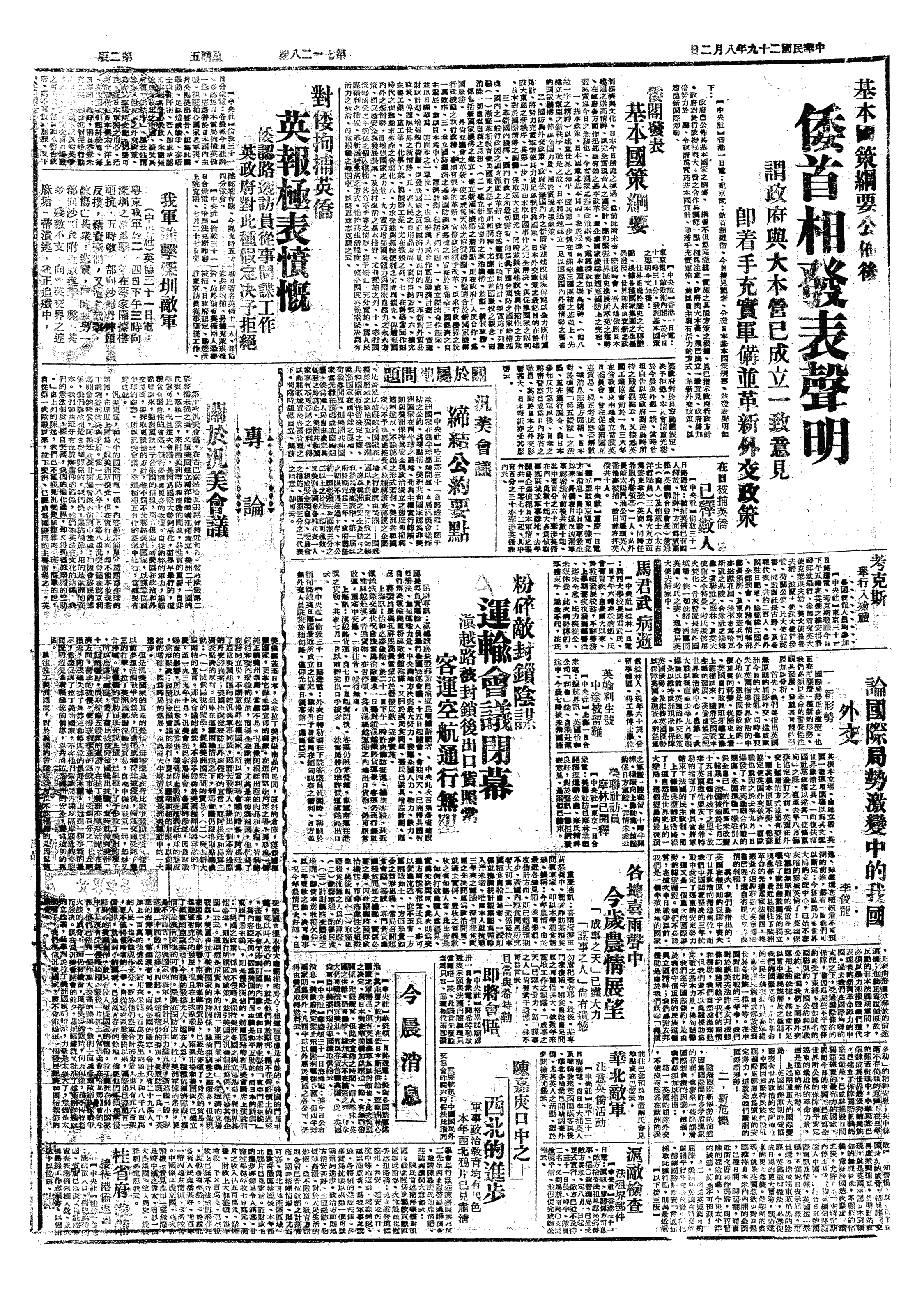 | 7223 | 002000000356A | 革命文獻—敵偽各情:敵情概況 | 蔣中正總統文物-革命文獻-抗戰時期- | 大公報載日本近衛文瞝內閣發表國策建立大東亞新秩序聲明 | 1940/08/02 | 1940/08/02 | 002-020300-00002-077 |