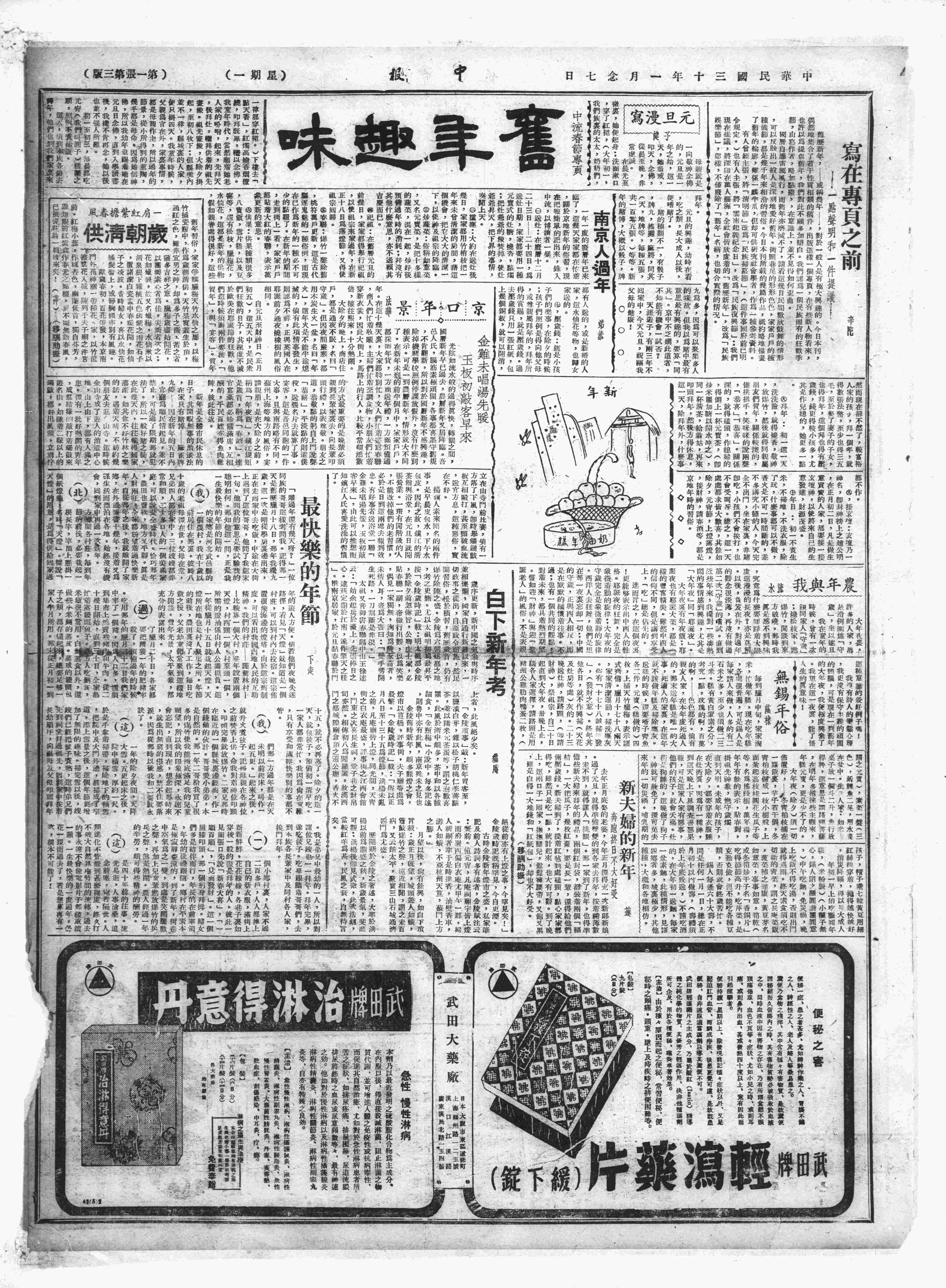 今日为阴历元旦,故昨晚爆竹声通宵不绝,今日则市上各店均关门,大有新气象,远甚于杭、绍、南京,亦较宜山为盛。