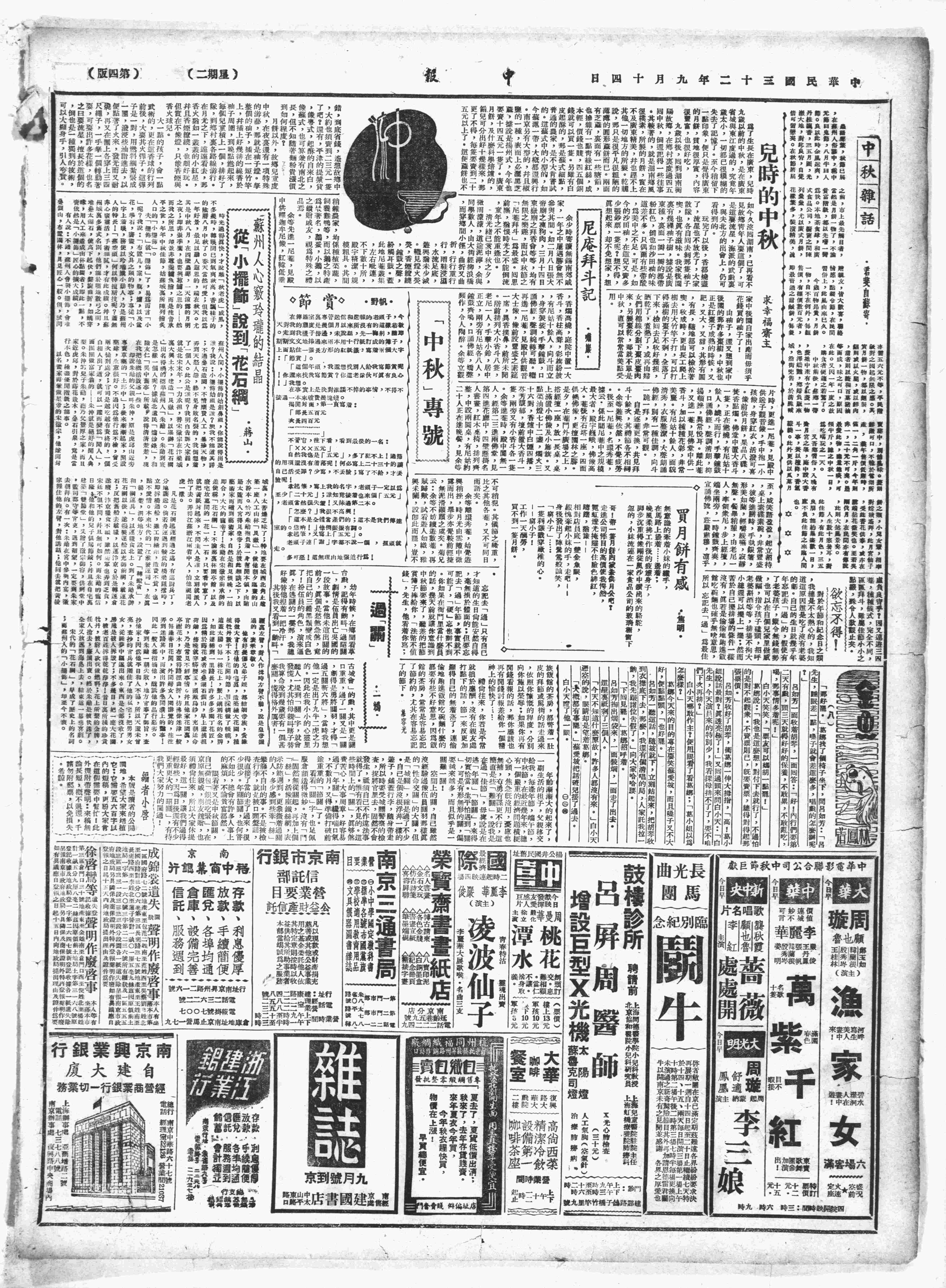 今日中秋节,晚间在凌纯声先生处作牌戏,散局后至牌坊头,明月中天,将月光下的景物变成银世界,令人低徊不忍遽舍,大家又坐下来,谈了一会儿,始回去睡觉。