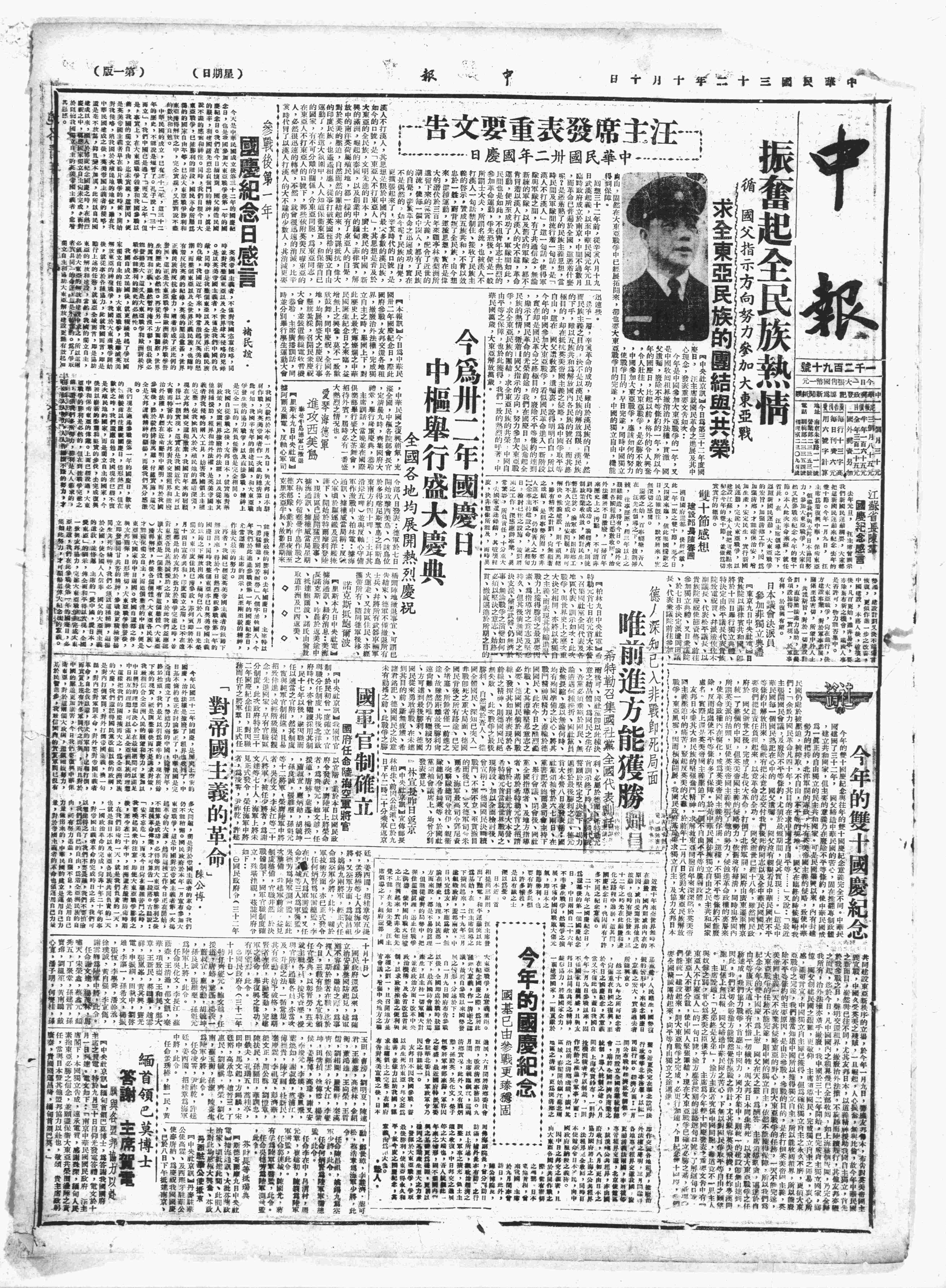 △ 汪精卫发表“国庆”文告,继续鼓吹“努力参加大东亚战争”,以“获得自由平等”。