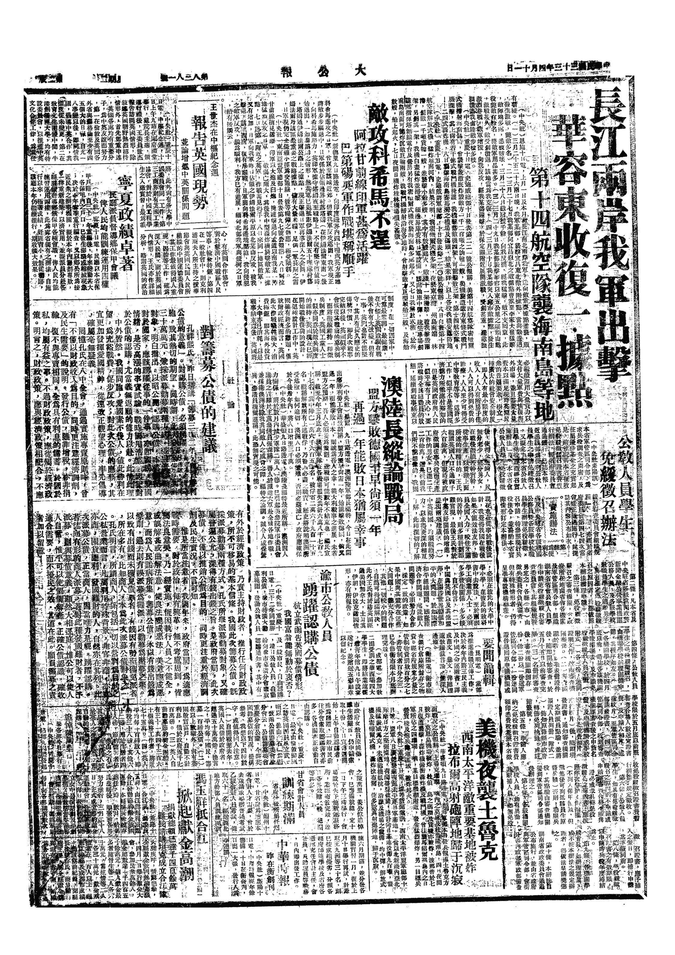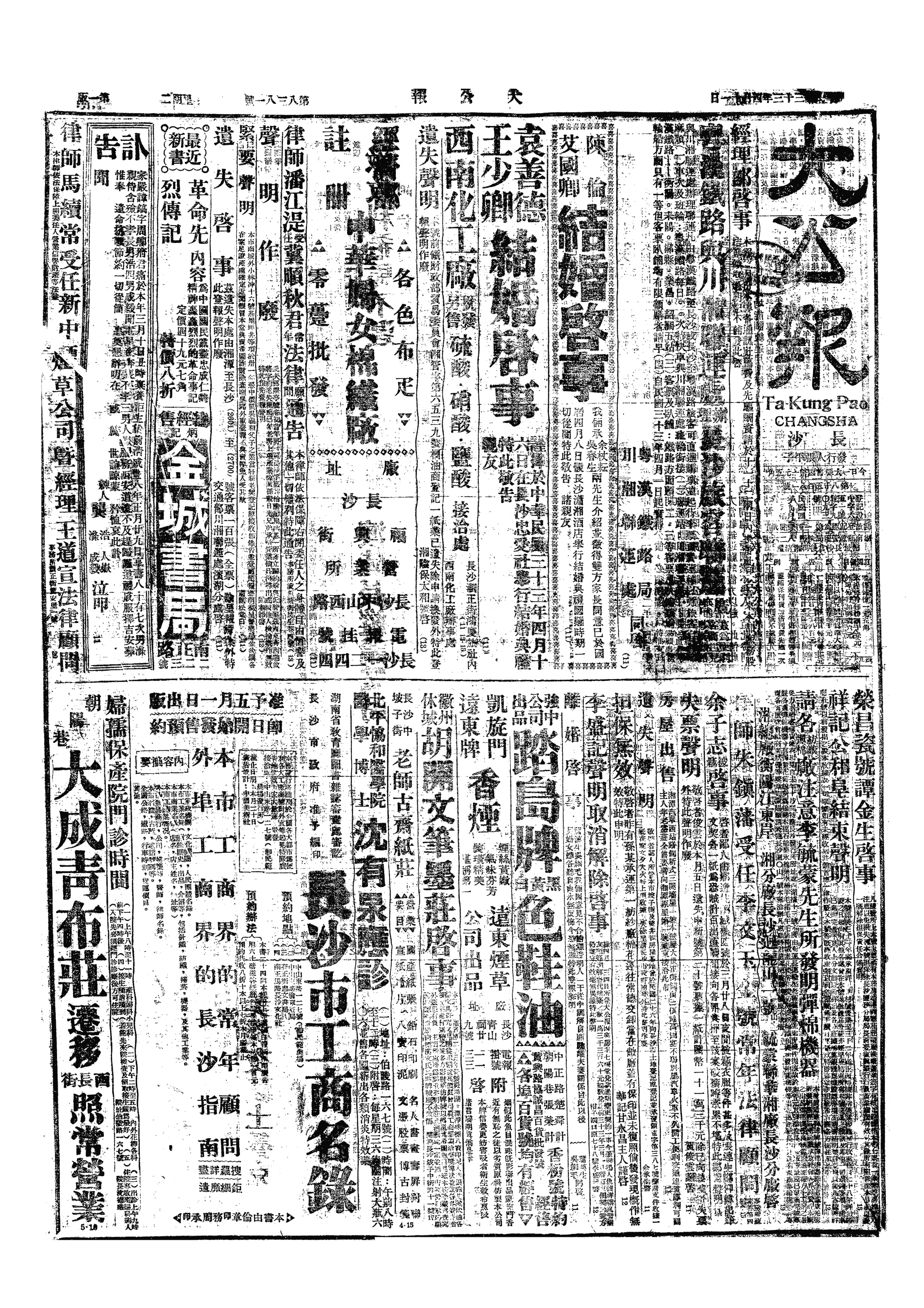△ 湖南衡阳《大刚报》因发表《贪污及其他》一文揭露湘政黑暗,自是日起被湖南省政府下令停刊三日。