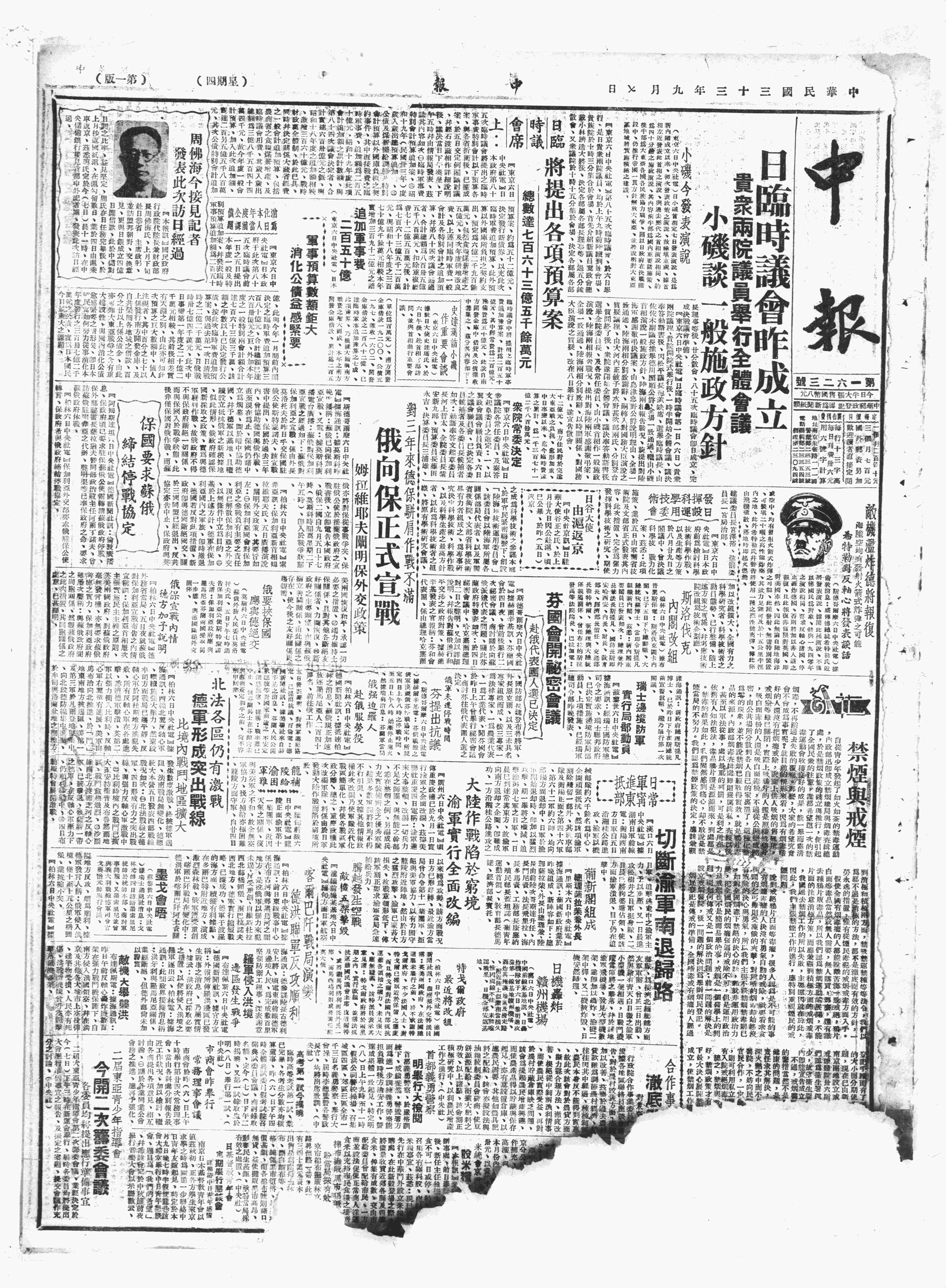 戊、日首相小矶向议会演说决战施策,海相米内谓战况不振。