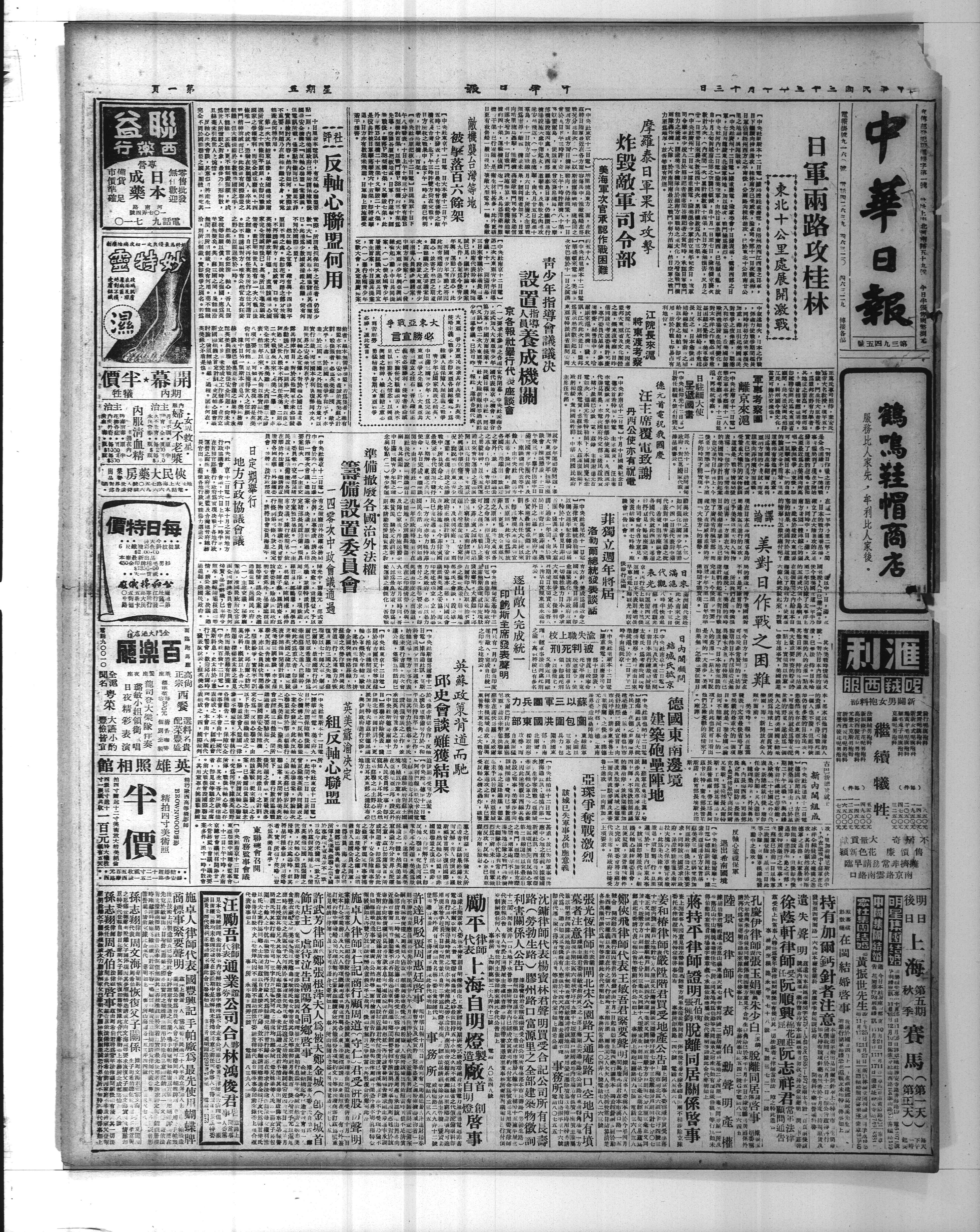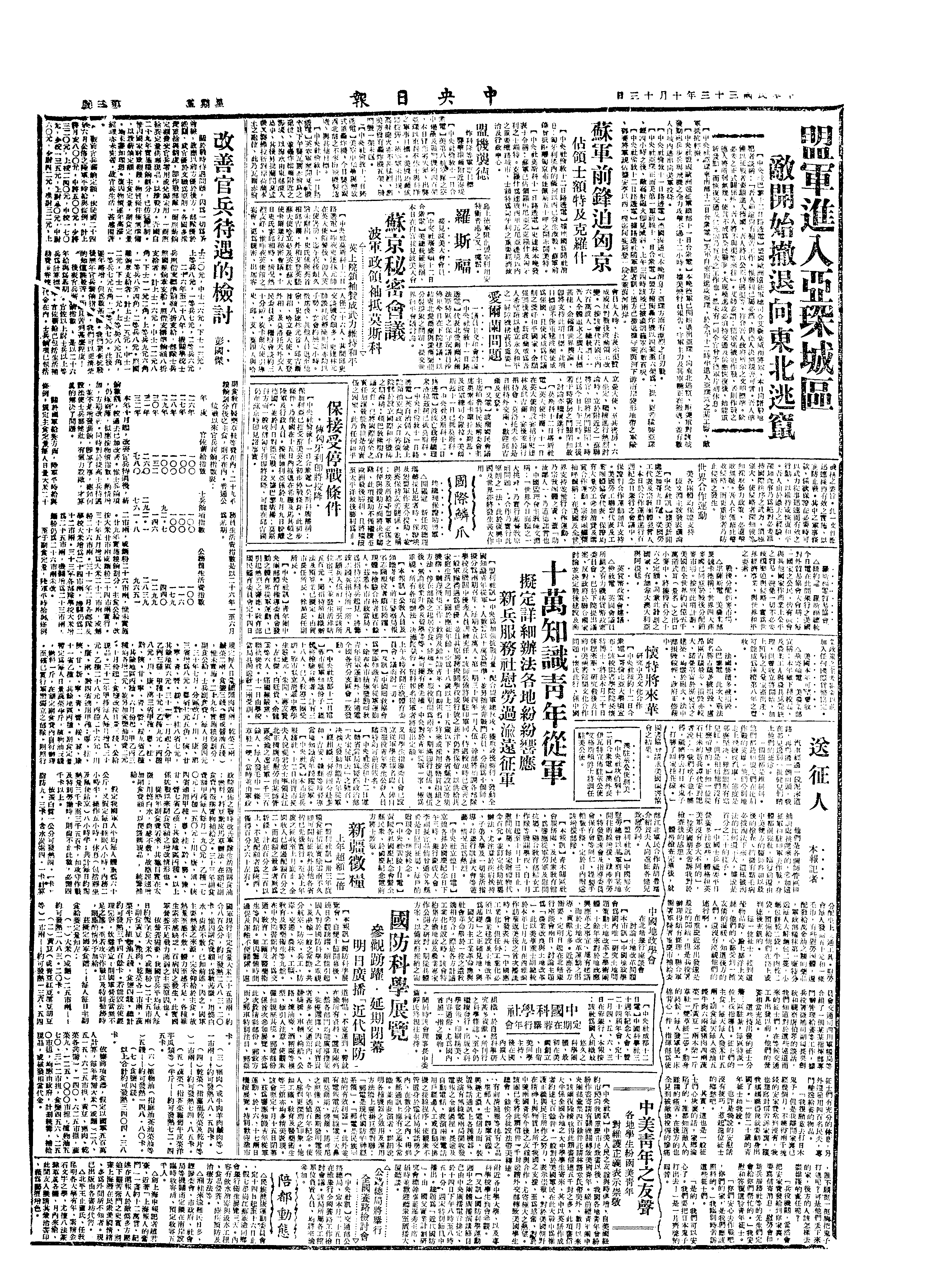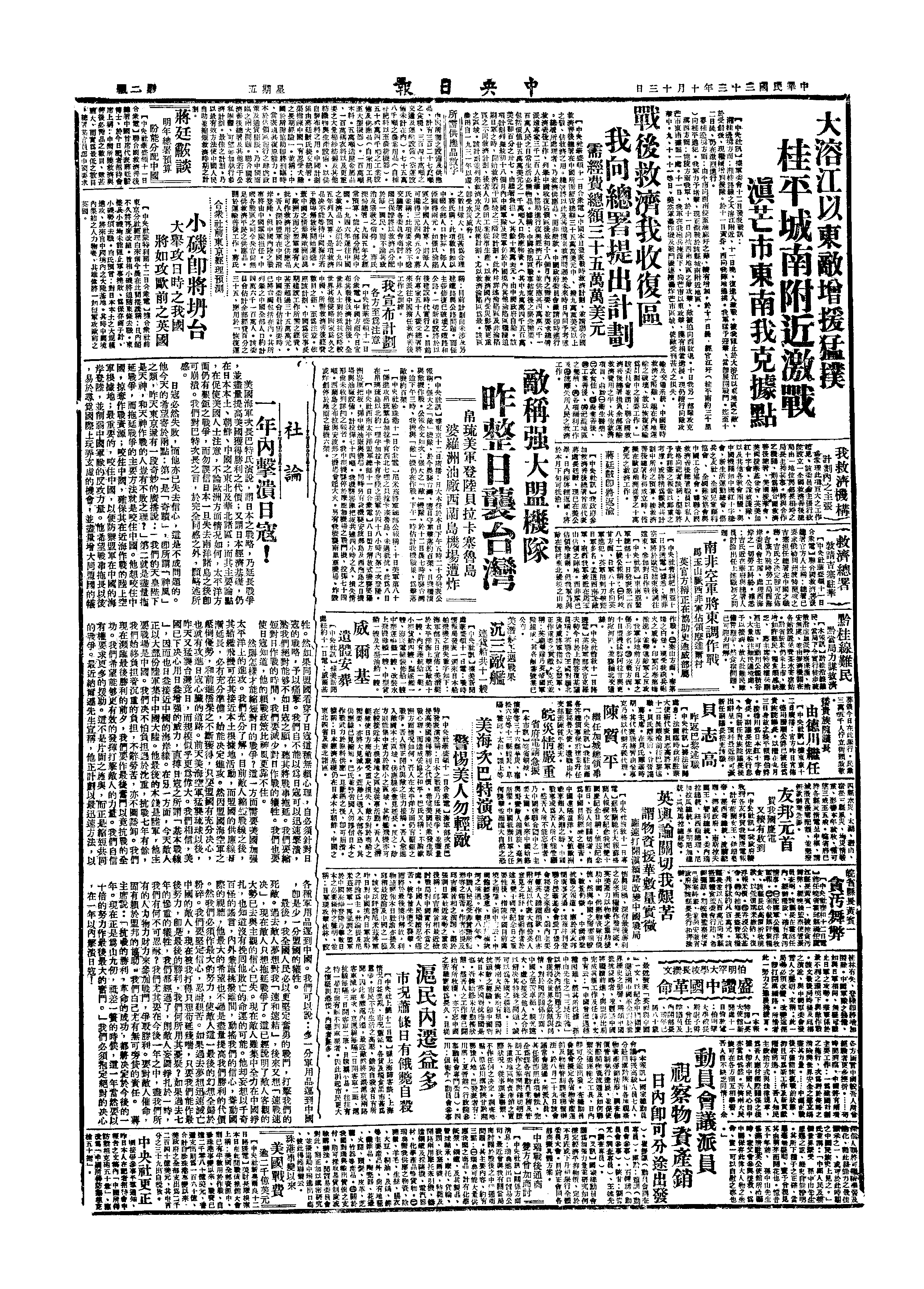 苏军克 Riga里加,围 Belgrade。德兵自匈京 Budapest布达佩斯撤退。广西桂平失守。美机炸台湾。