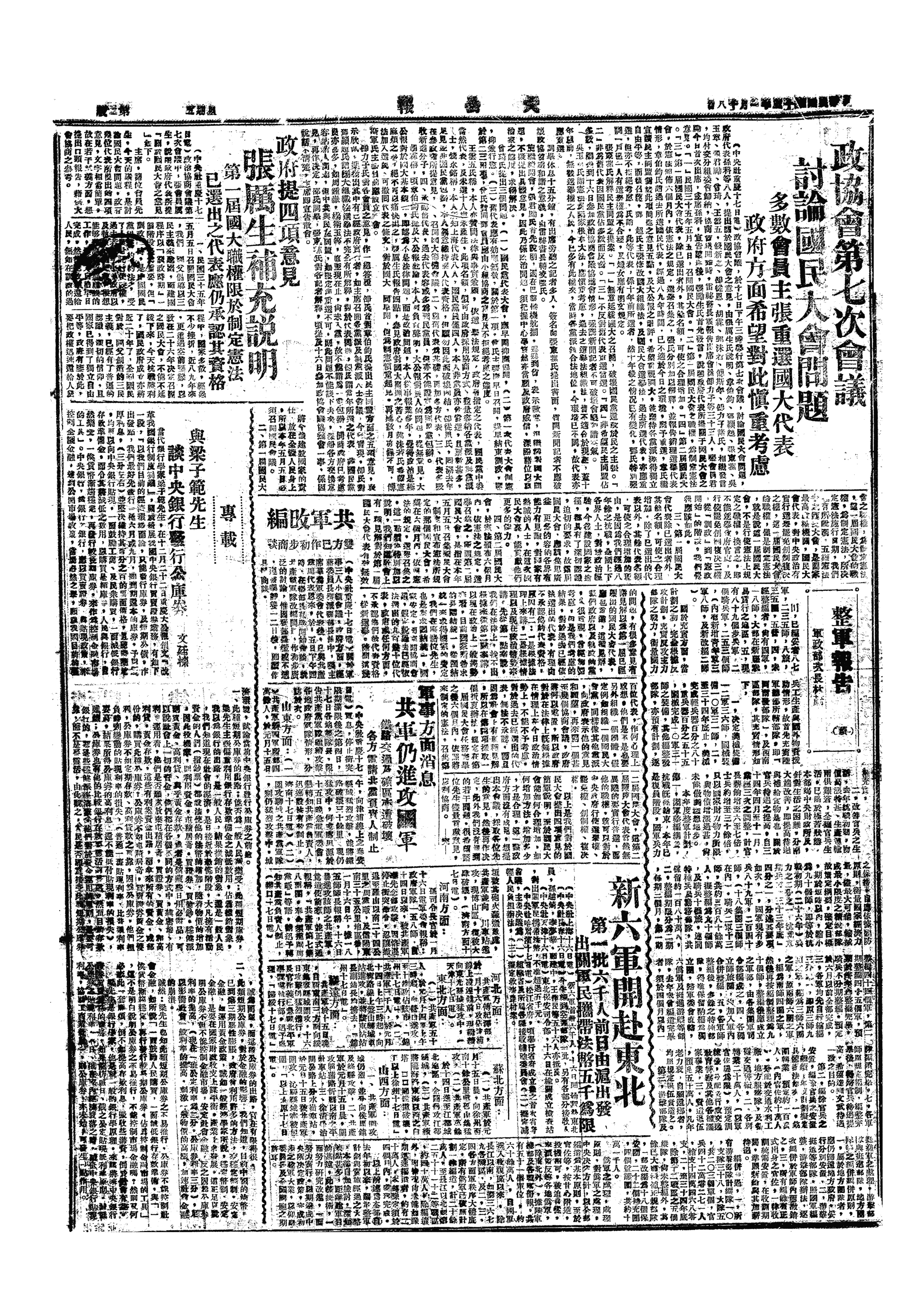 上午,政治协商会议第8次会议,续议国民大会问题,承认或否认旧代表为争论焦点。