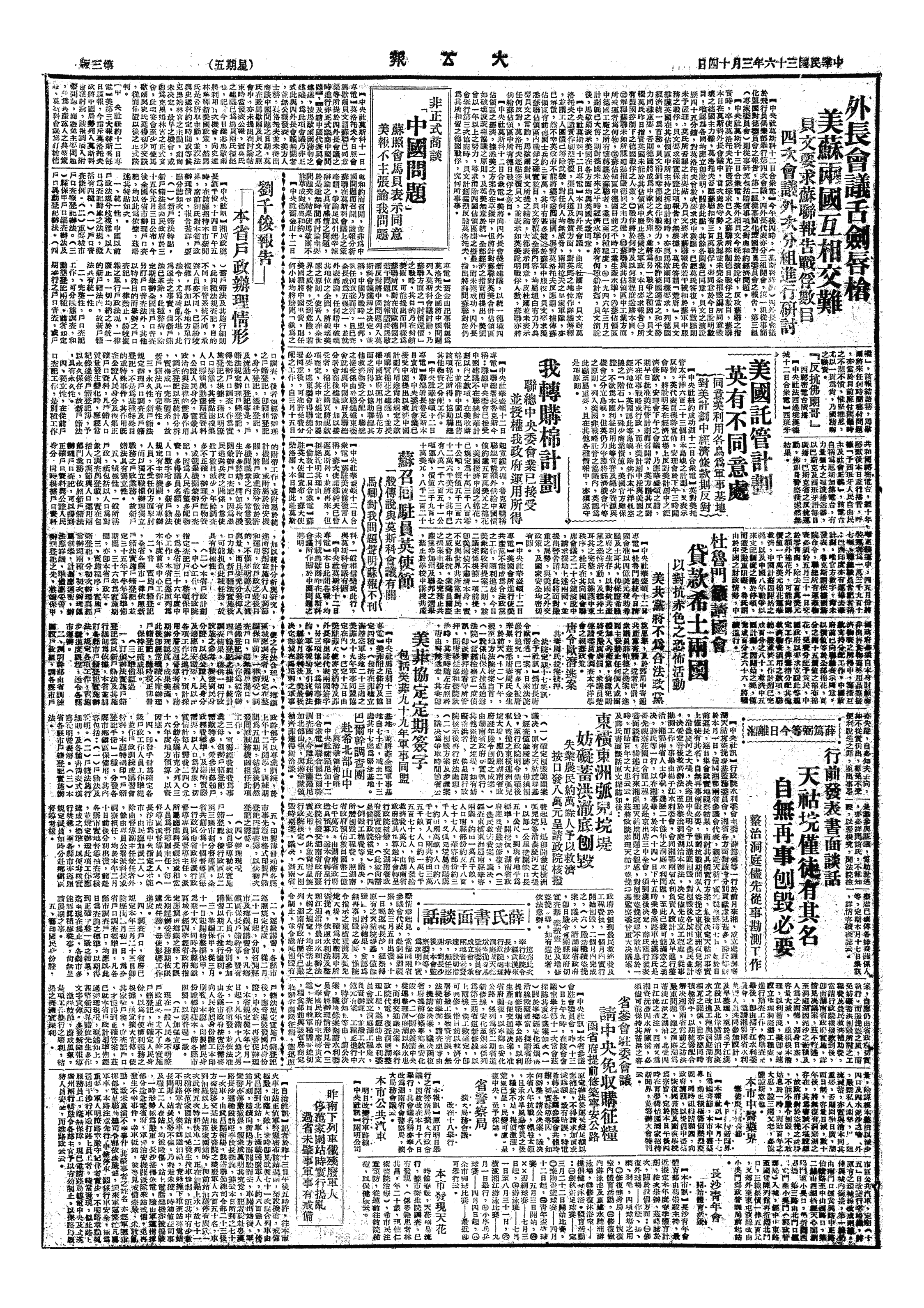 △ 民社党主席张君劢主张中国派代表参加莫斯科外长会议,谓四强已同意非正式讨论中国问题,“与其让人家讨论,不如我自身参加”。