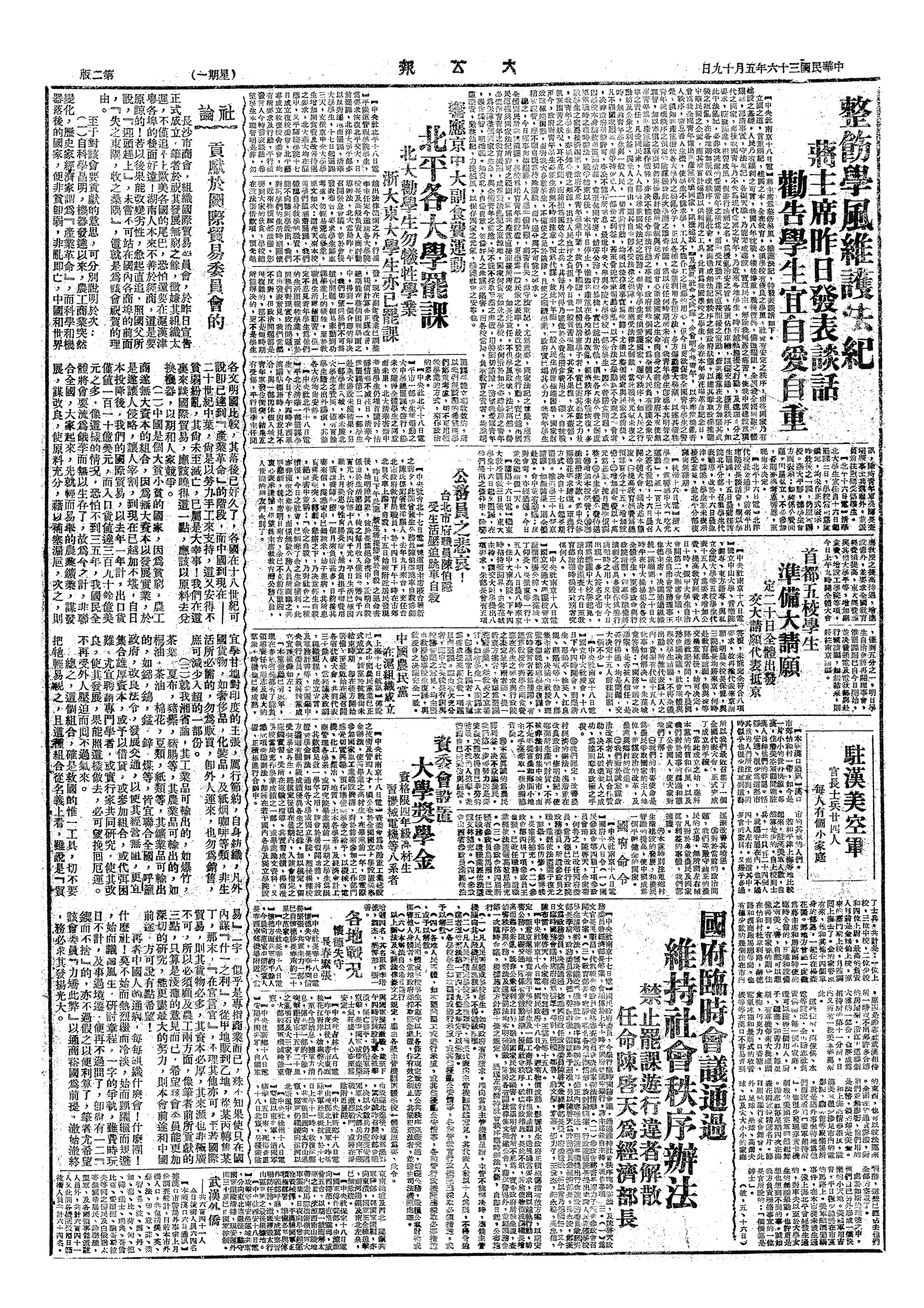 甲、蒋主席发表谈话,整饬学风,维护法纪,必要时将采取断然处置。