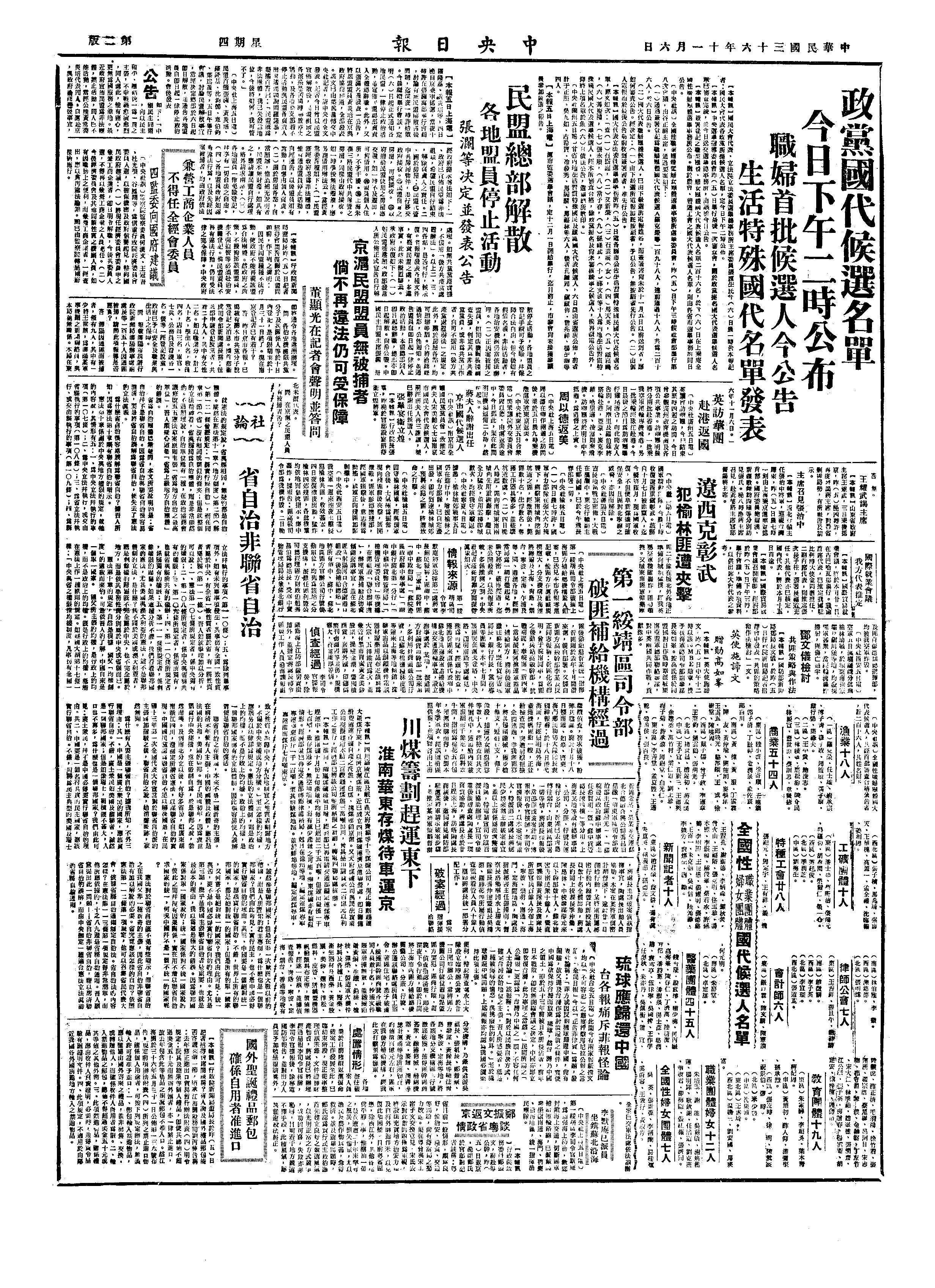 中国民主同盟主席张澜发表公告,说明民盟已被政府宣布为非法团体,经与政府洽谈后,决定即日起停止活动,总部同人总辞职,总部即日解散。