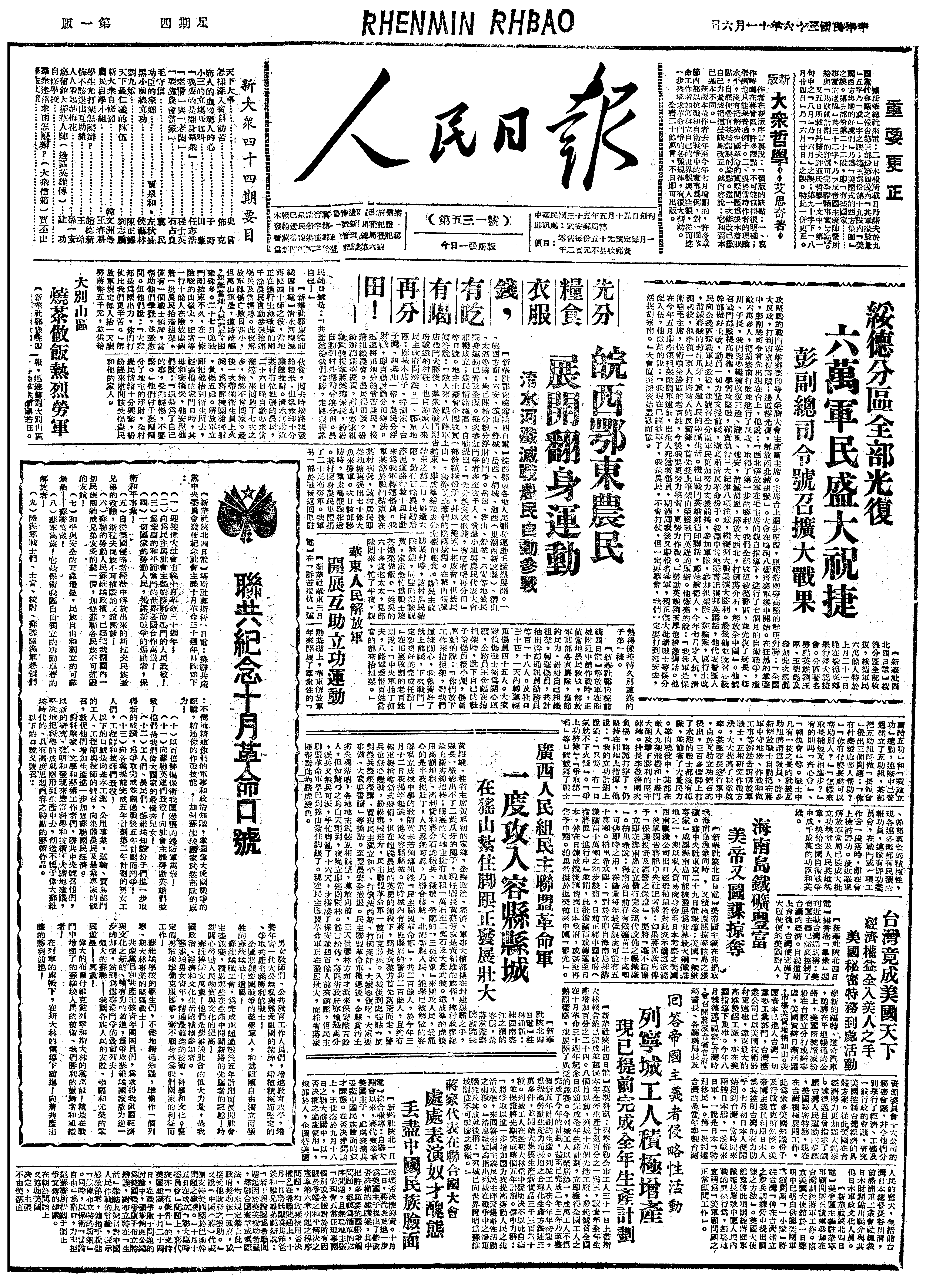 当此庆祝10月革命三十年的日子,中国人民应当相信,我们苦难的日子是完全能够度过的,什么困难也能克服,获有美国帝国主义援助的蒋介石反动集团,我们完全有把握将其彻底打倒。