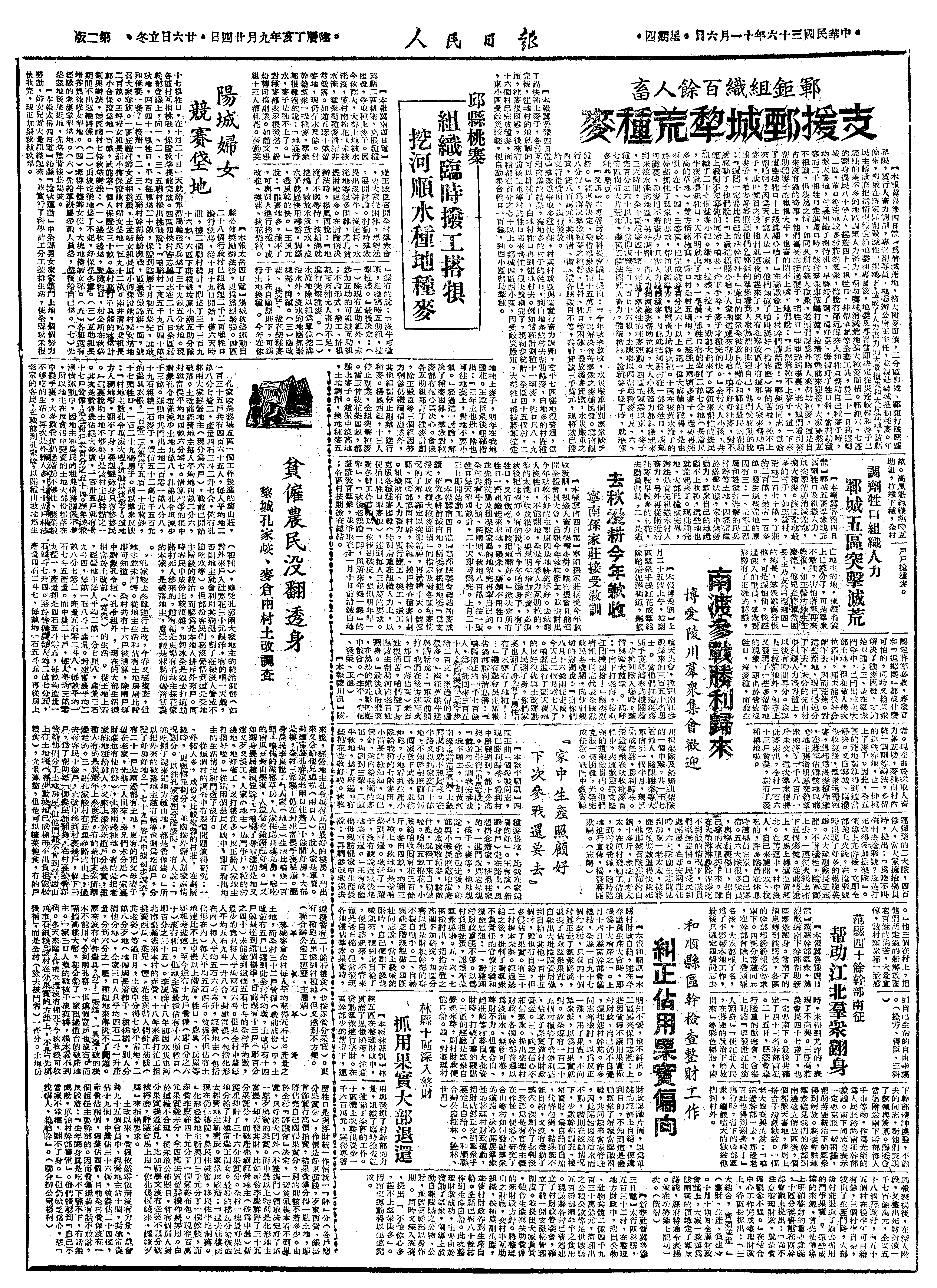 邱县二区桃寨,克服种种困难,争取种上麦子。