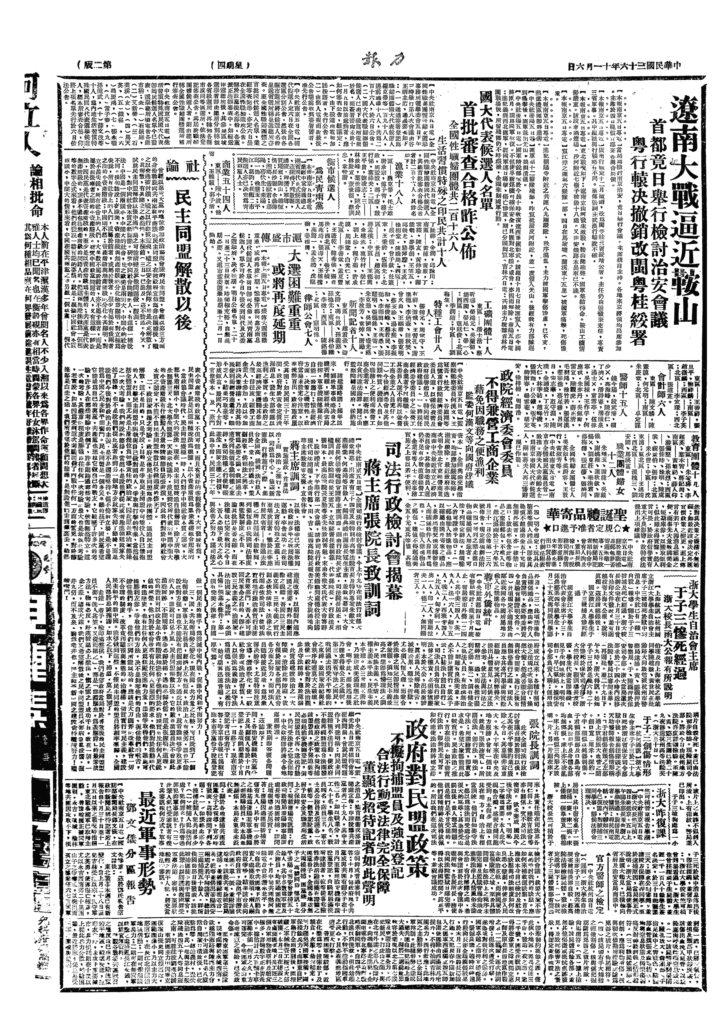 △ 北平各大、中学校学生总罢课一天,并在校内“局部绝食”,抗议浙大学生自治会主席于子三在狱中惨遭杀害,及国民党在各地逮捕屠杀学生的暴行。
