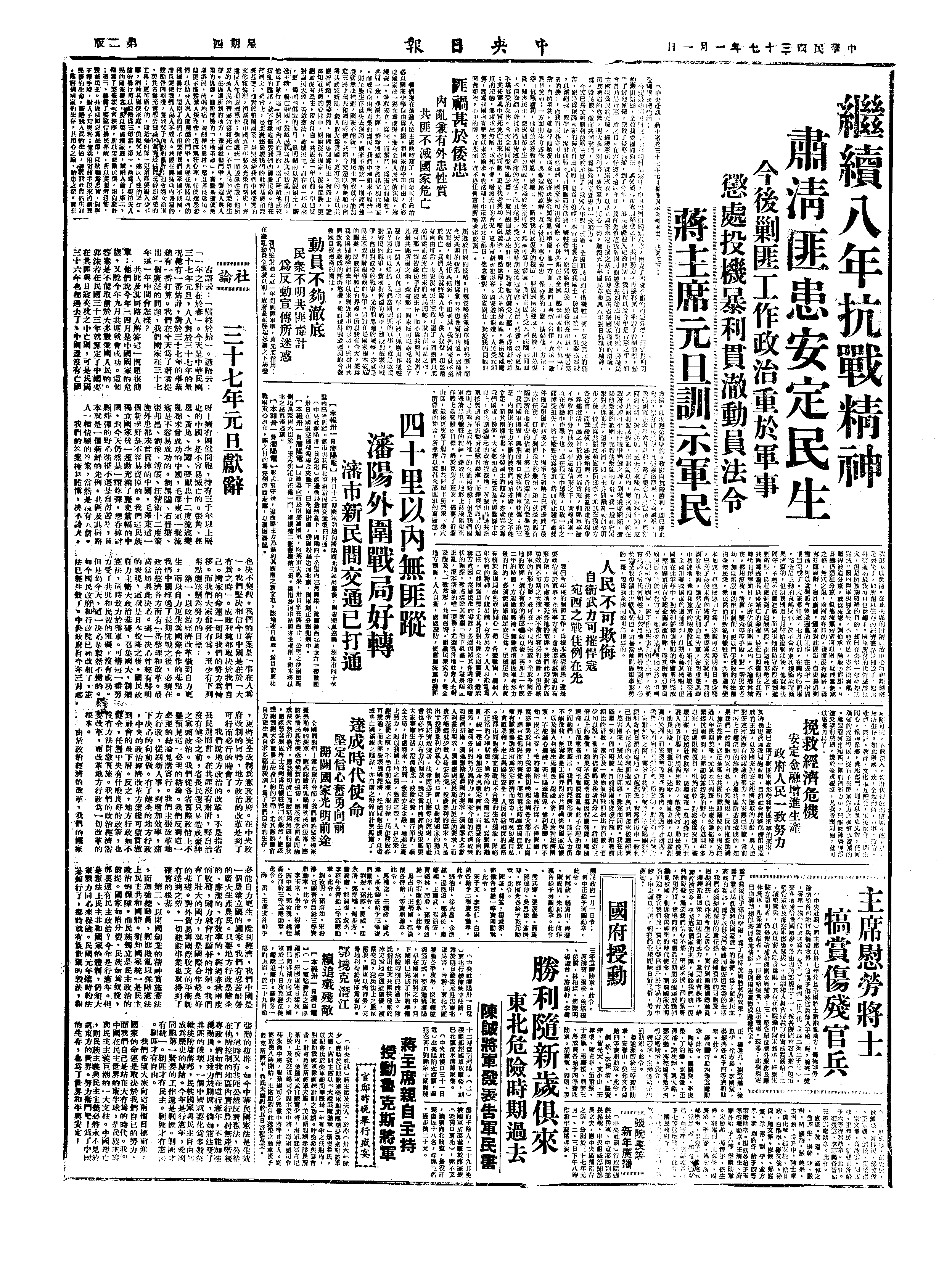 蒋介石发表题为《继续八年抗战精神,肃清匪患安定民生》的元旦广播词,声称将在“一年内消灭共军主力”,全国各地的“散匪”也可望能在一二年内“肃清”。