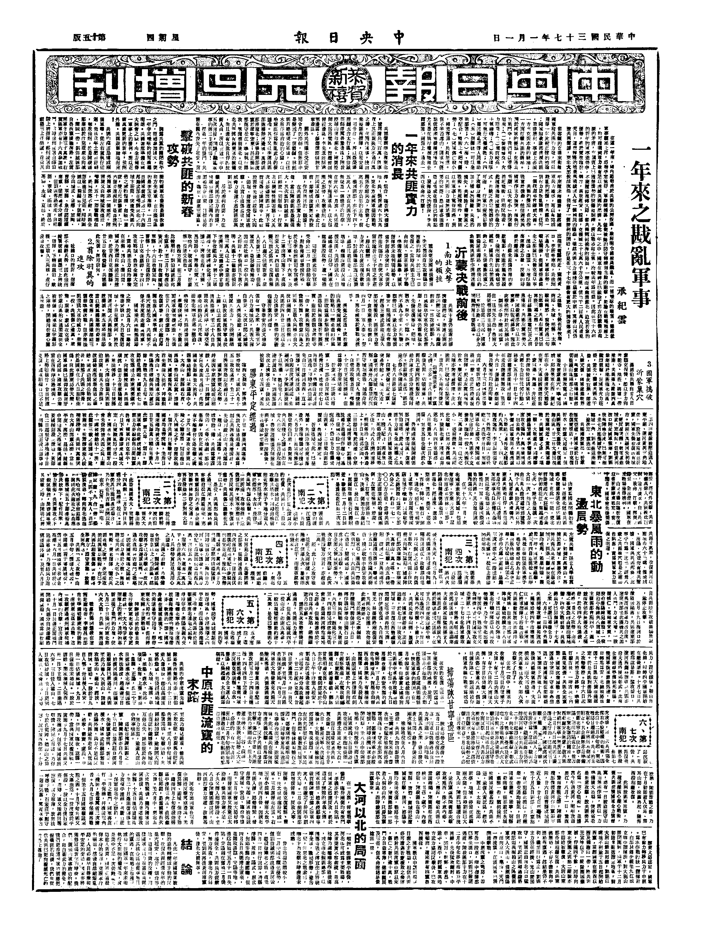 △ 参谋总长兼国民政府主席东北行辕主任陈诚在沈阳发表元旦《告东北军民书》,宣布危机已过,战备完成,即将由铁岭、沈阳、新民三路(以新六军、新三军为右路,新七十一军、新一军为中路,新五军为左路)出兵,向沈阳西北作扇形推进,与东北人民解放军决战。