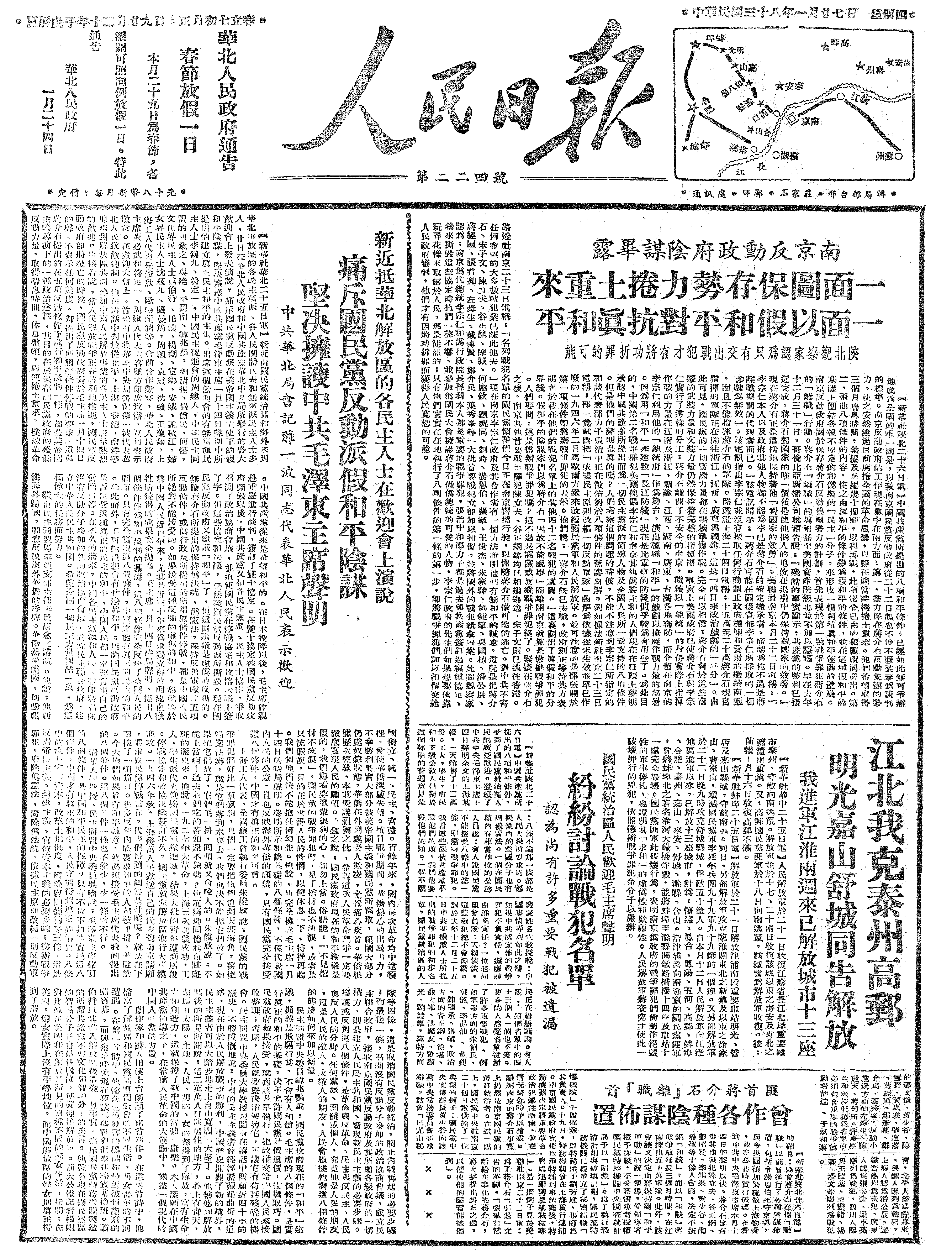 △ 国防部发布文告,宣称为了缩短战争,保护古都北平,同意傅作义宣布于22日上午10时起休战;