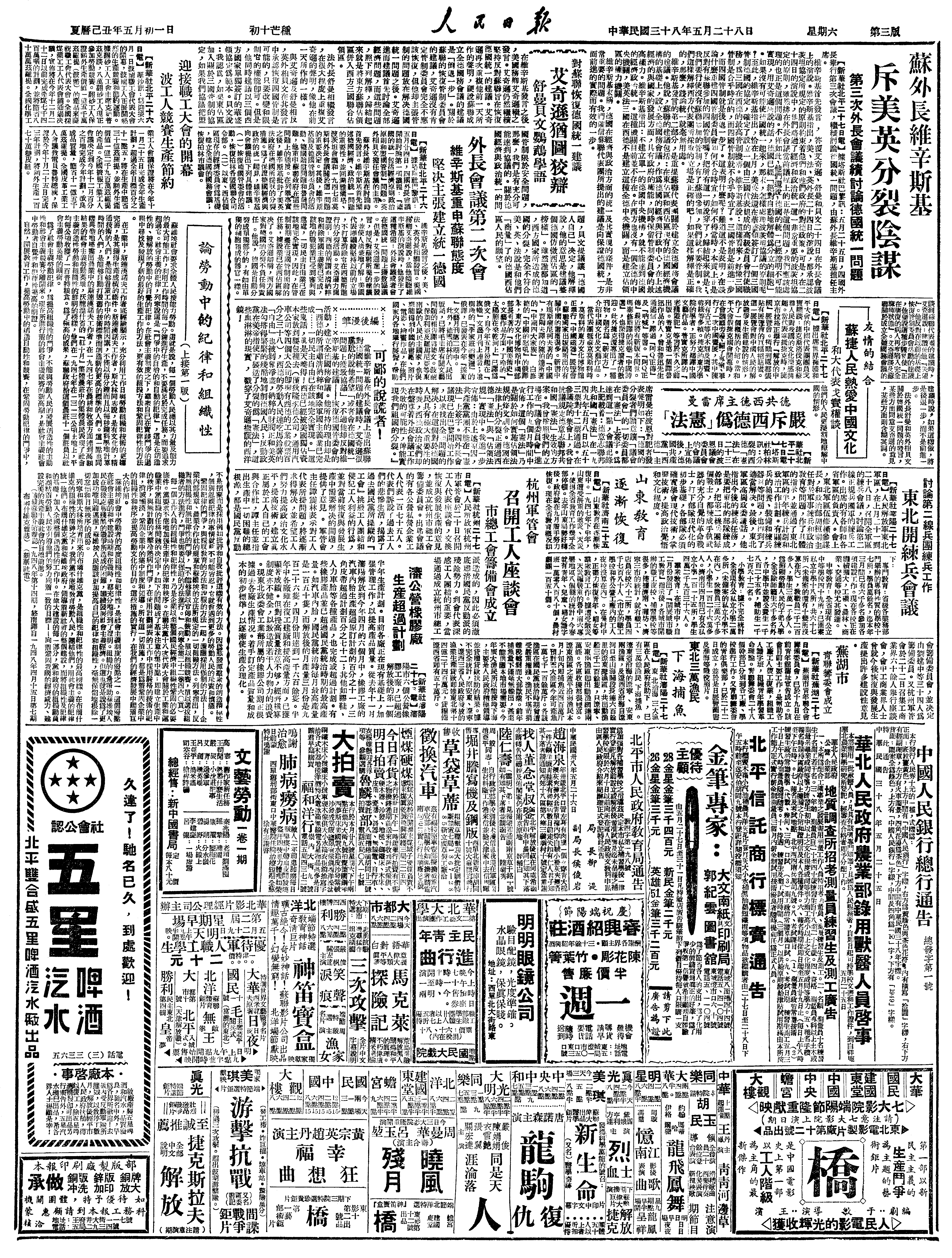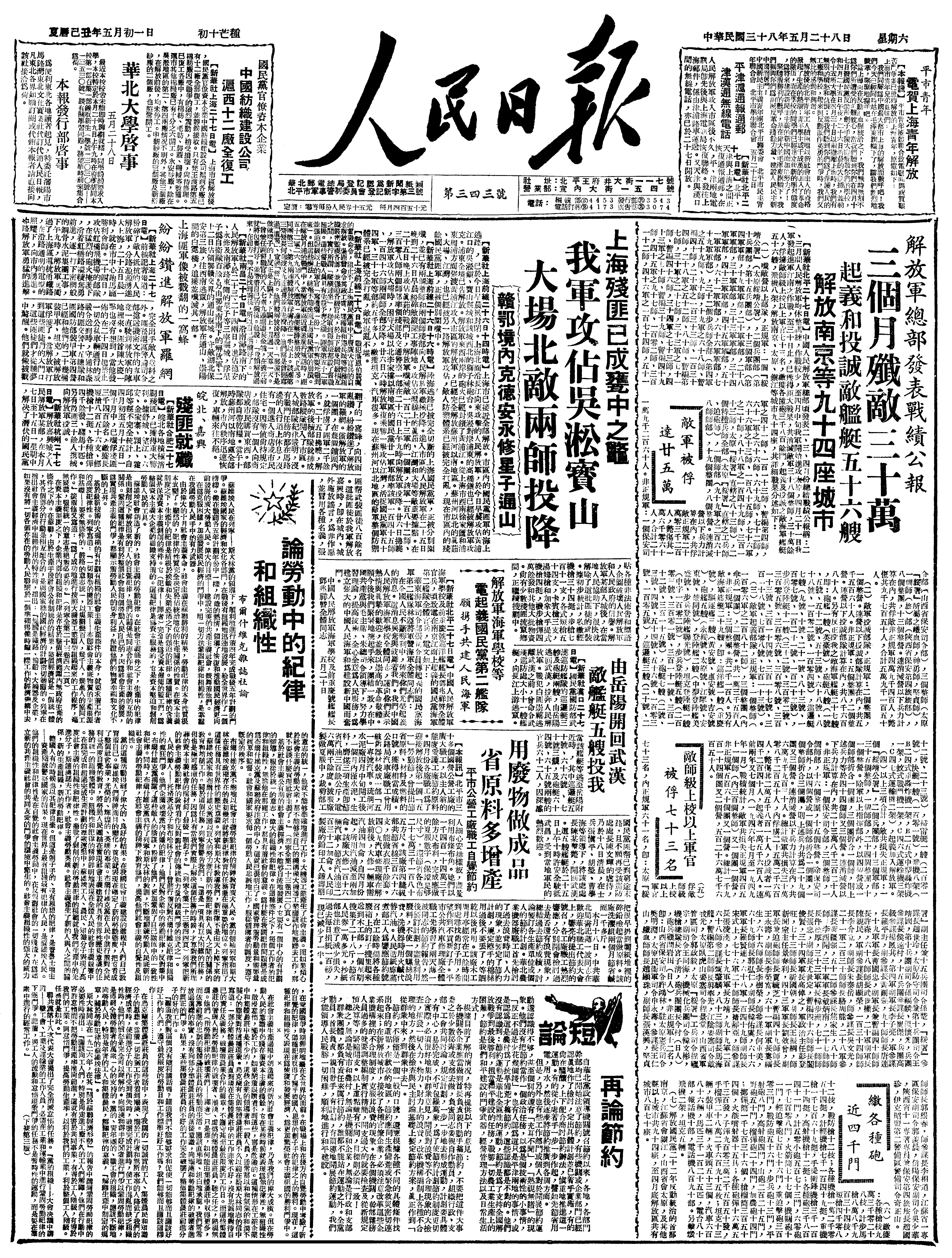 △ 《解放日报》在上海发刊,发刊词题为《庆祝大上海的解放》。