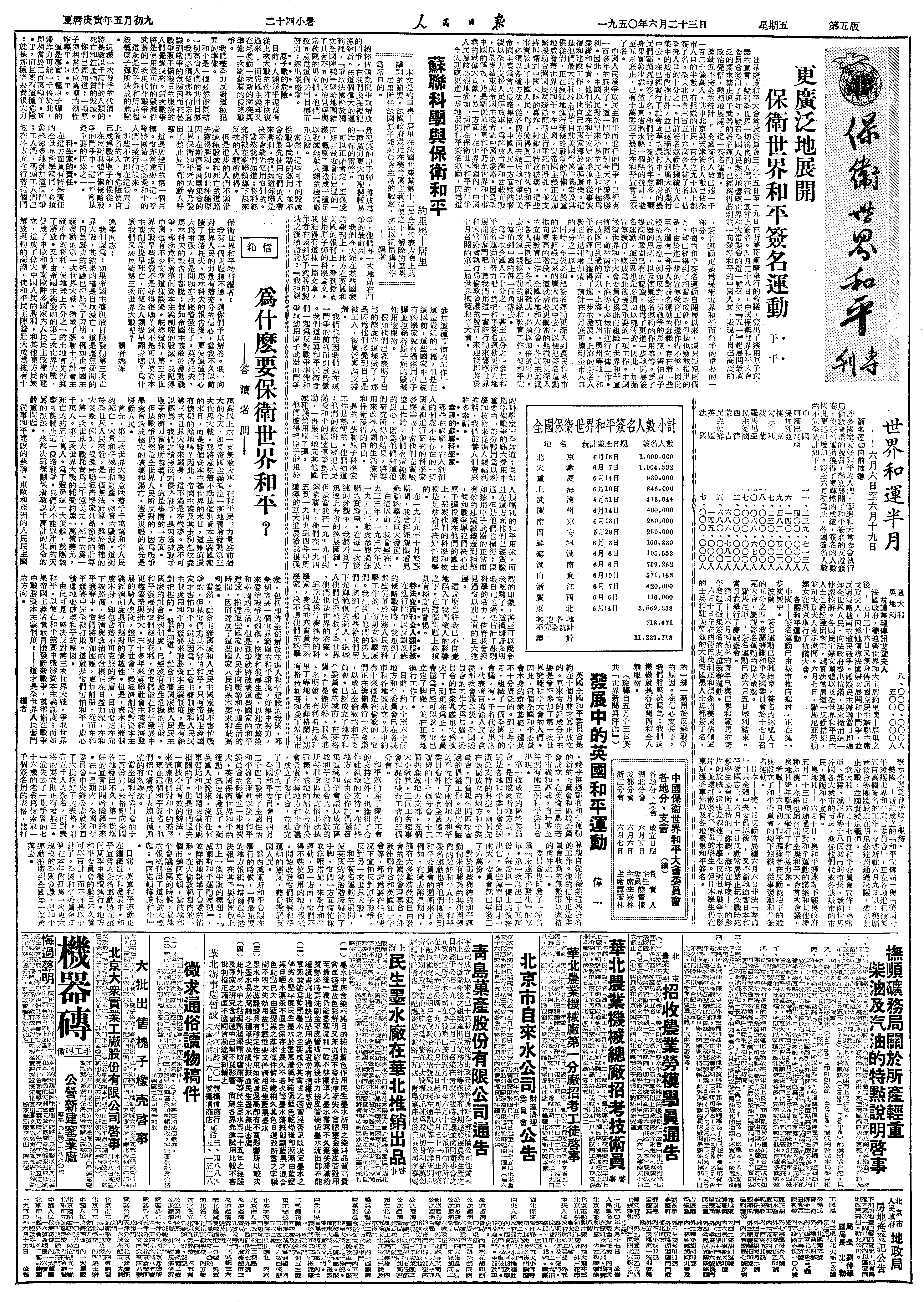 为争取全国人口十分之一、甚至五分之一参加和平签名运动而努力吧,为把和平签名运动更深入地展开而奋斗吧,让我们用这一实际行动来响应世界和大常委会执行局伦敦会议的号召,来迎接即将于10月召开的第2届世界拥护和平大会。