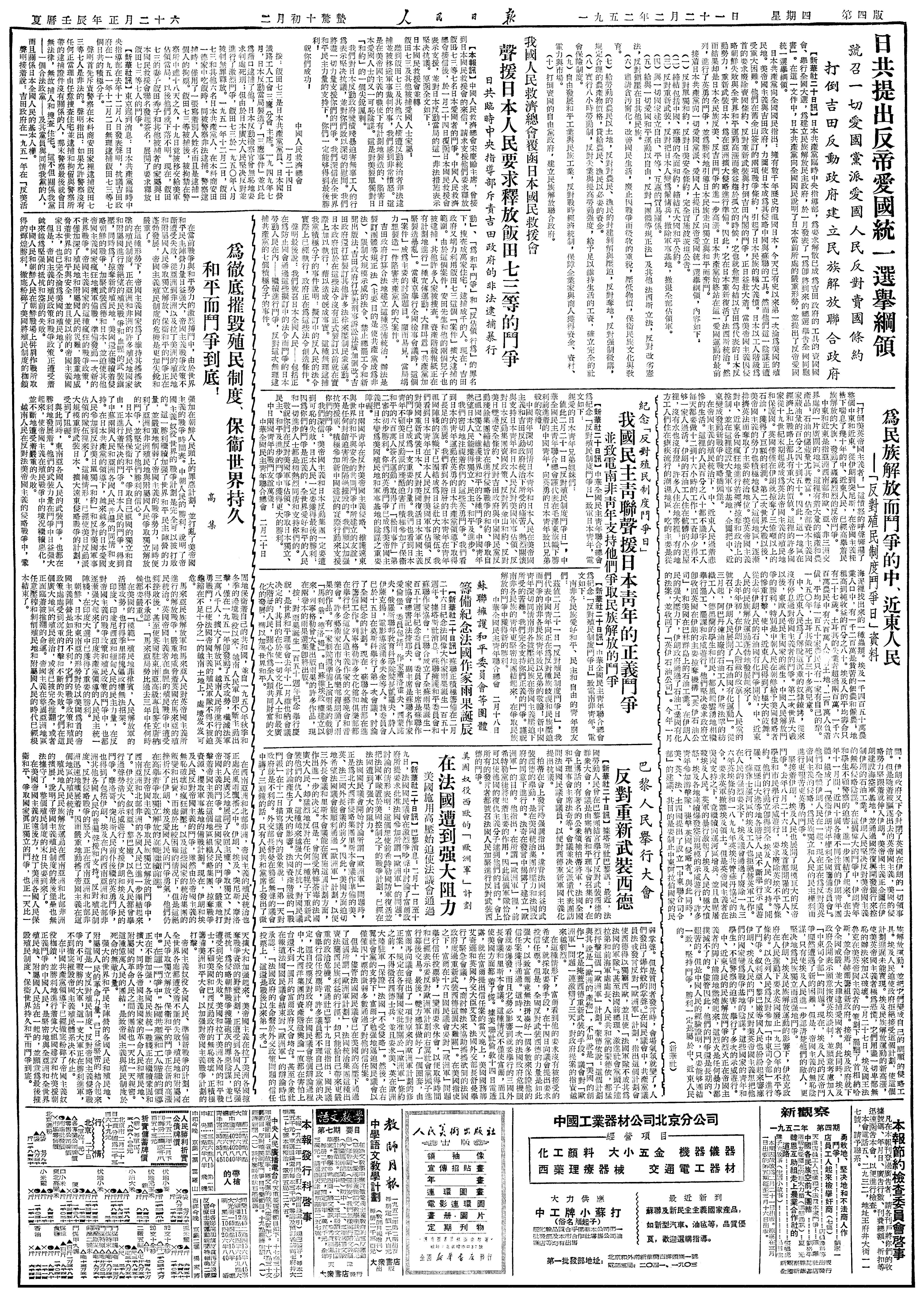 b4-纪念反对殖民制度斗争日我国民主青联声援日本青年的正义斗争并致电南非青年支持他们争取民族解放的斗争