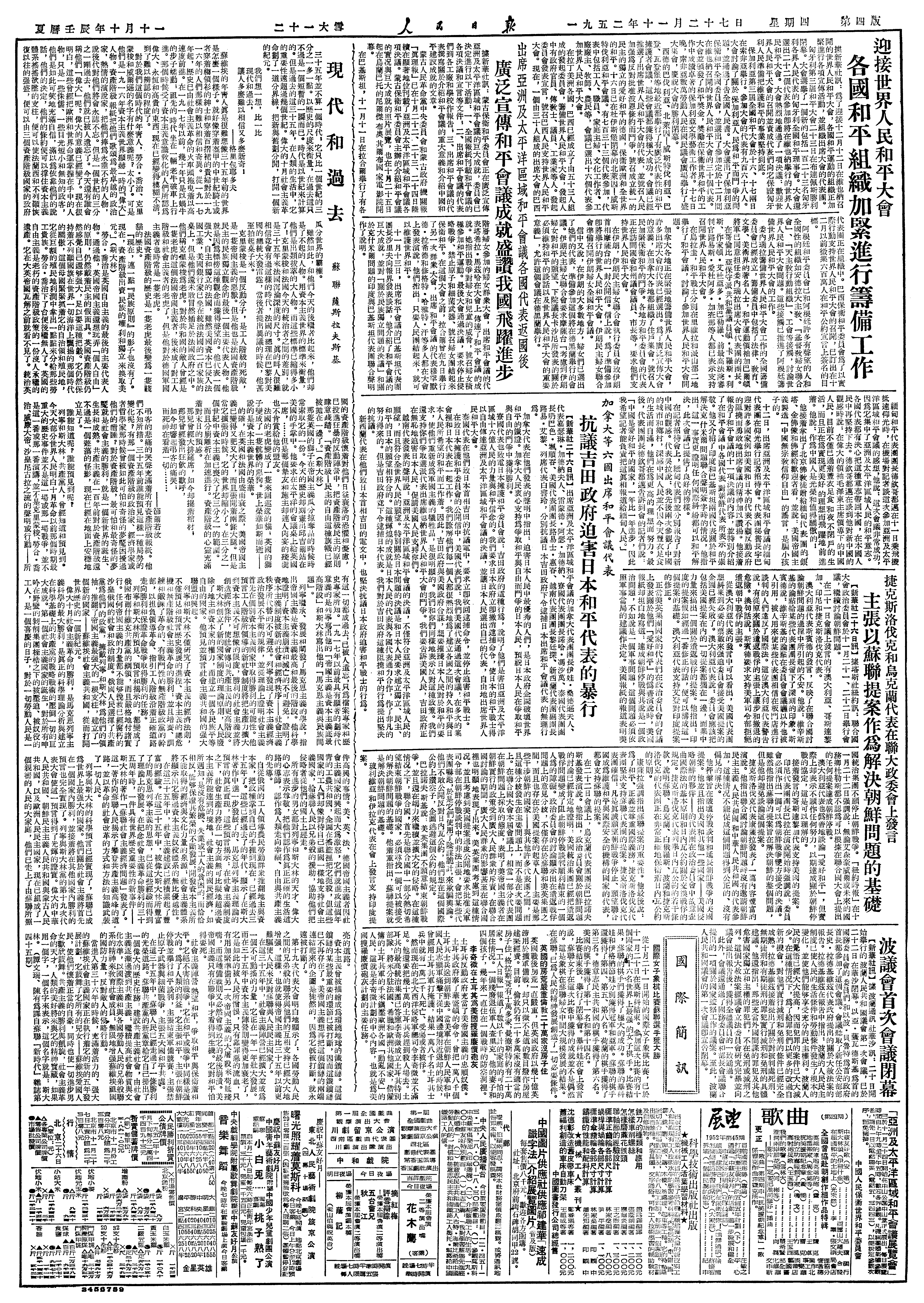为了人类的利益,它主张和平,主张在朝鲜停战并举行和平谈判,主张结束军备竞赛,主张禁止原子武器与细菌战争,主张五大国和平共处。