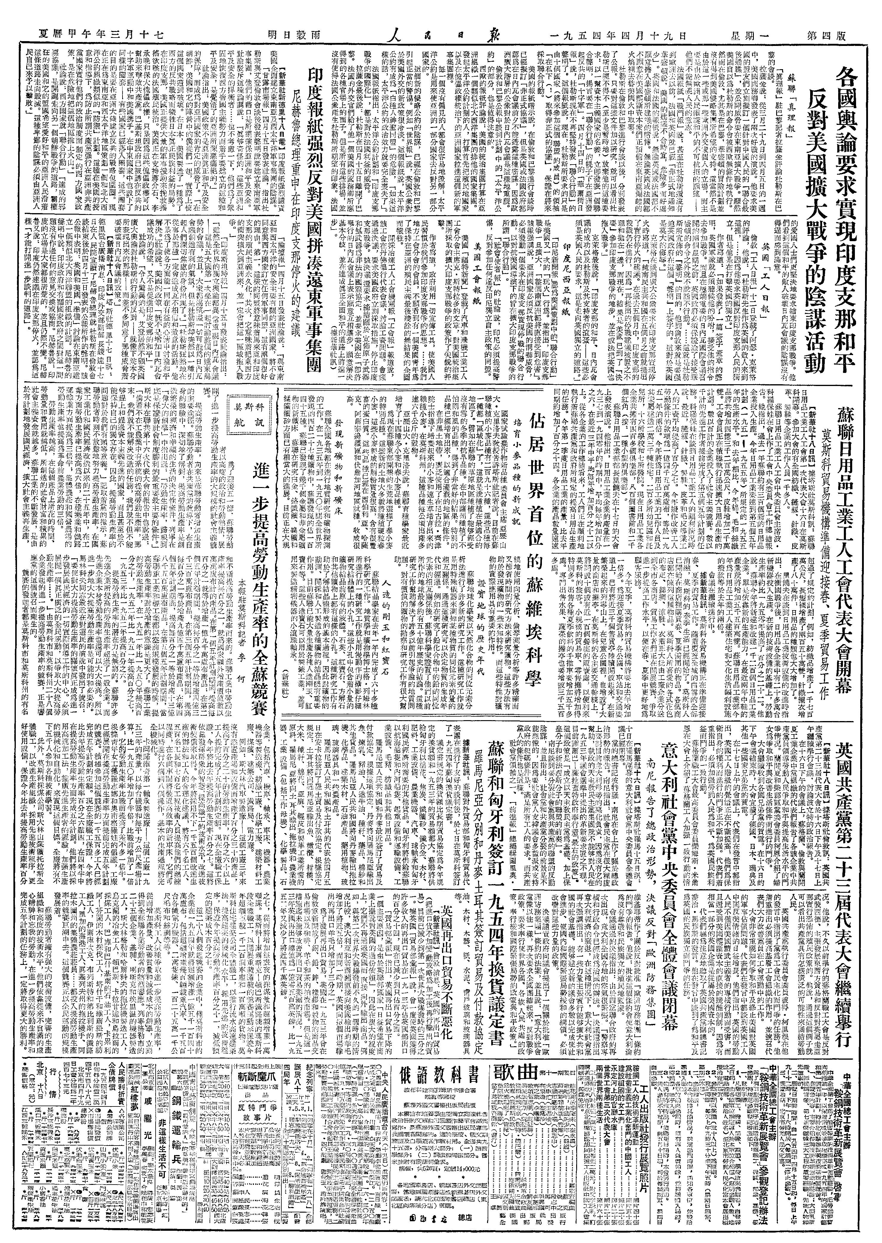 为了迎接五一节,苏联劳动者以高度的政治和劳动热情,展开了进一步提高劳动生产率的大规模的社会主义竞赛。