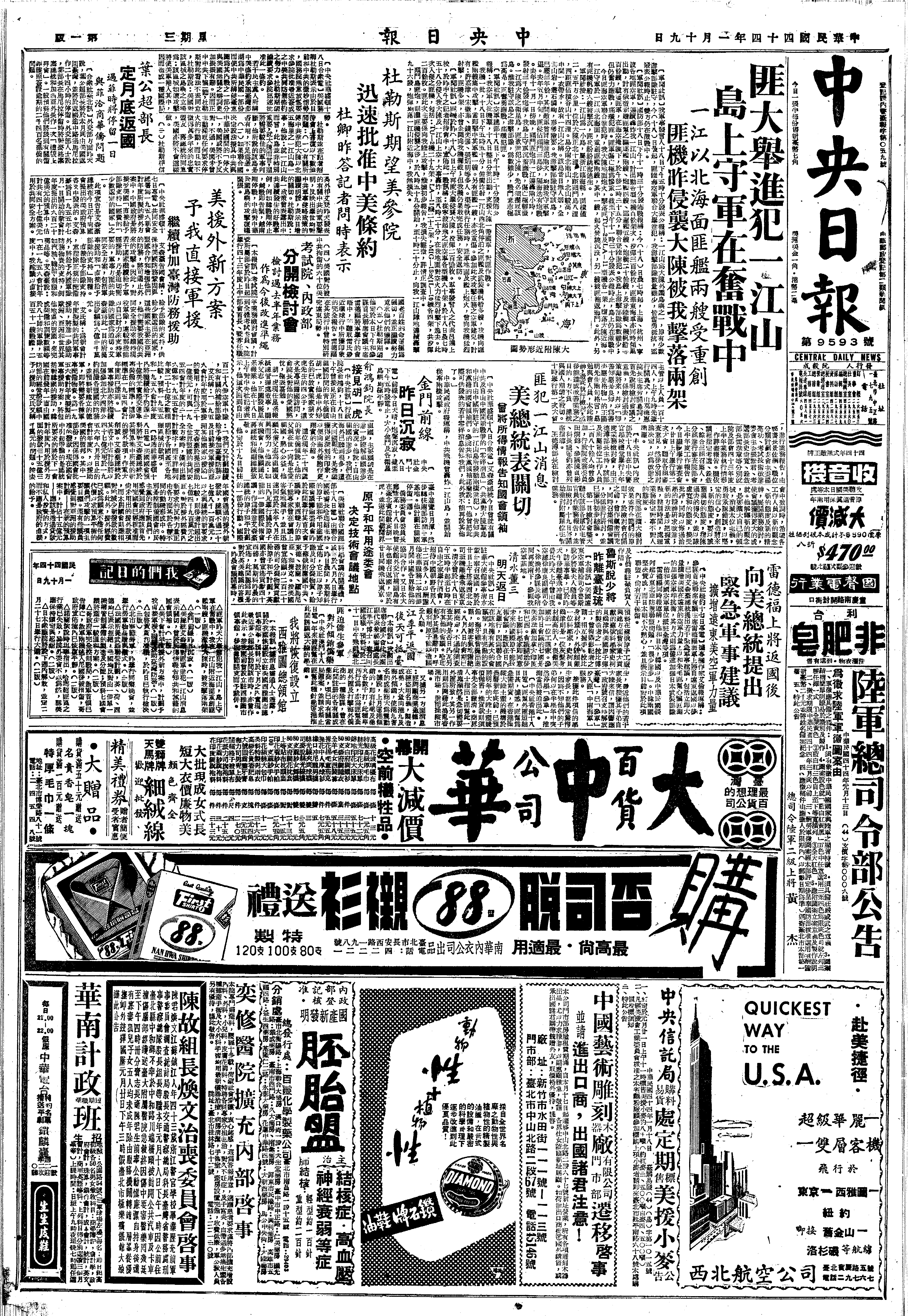 Eisenhower in a press conference in effect appealed to the U.N. to try for a cease-fire. He belittled the importance of Yikiangshan 【一江山島].
