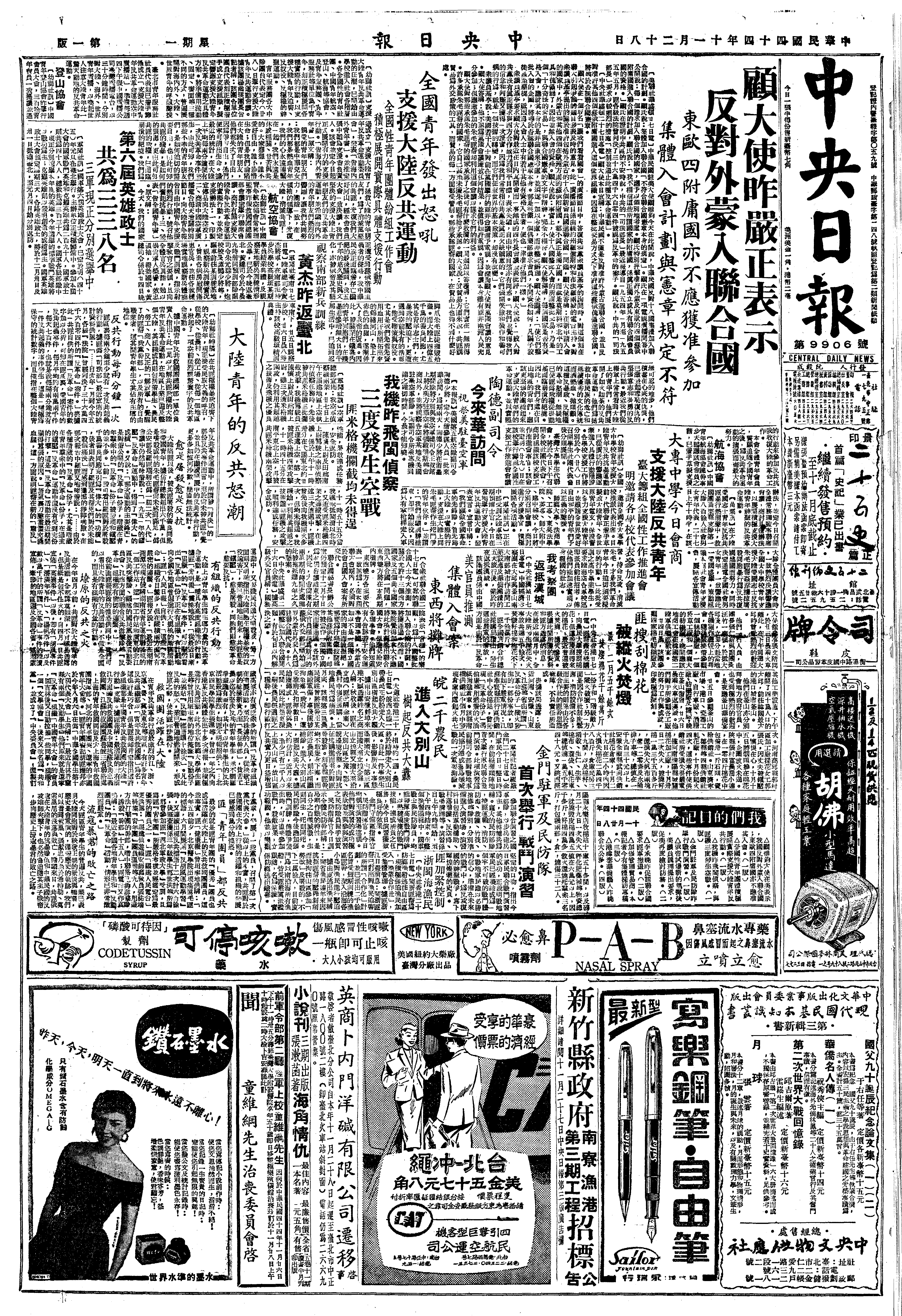 Whole day in the office, studying documents related to admission of new members, Gimo’s 【蔣中正] reply to Ike, relayed here by Koo 【顧維鈞], turned out to be strong, courteous, and well-argued. Cabled back my congratulations. Inside the U.N., people know that we are unalterably opposed to Mongolia. Outside, people ignore China entirely, forgetting that China is one of the five permanent representatives, with the right of veto.