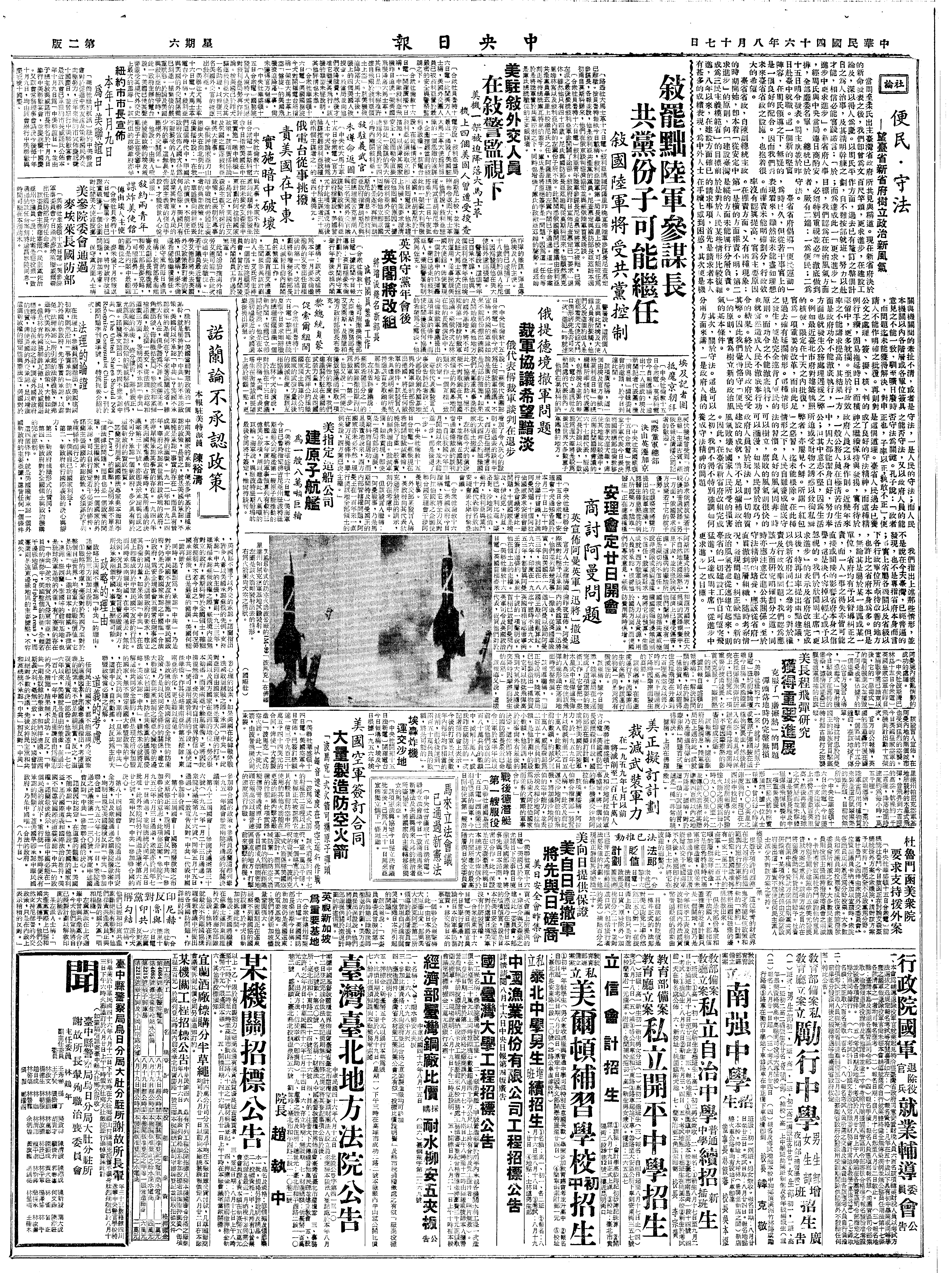 三、美国军事政策渐趋于局部战与原子战术之准备,而且其裁军之空中视察案避免大陆匪区之计划,此皆与我所想象者接近矣。