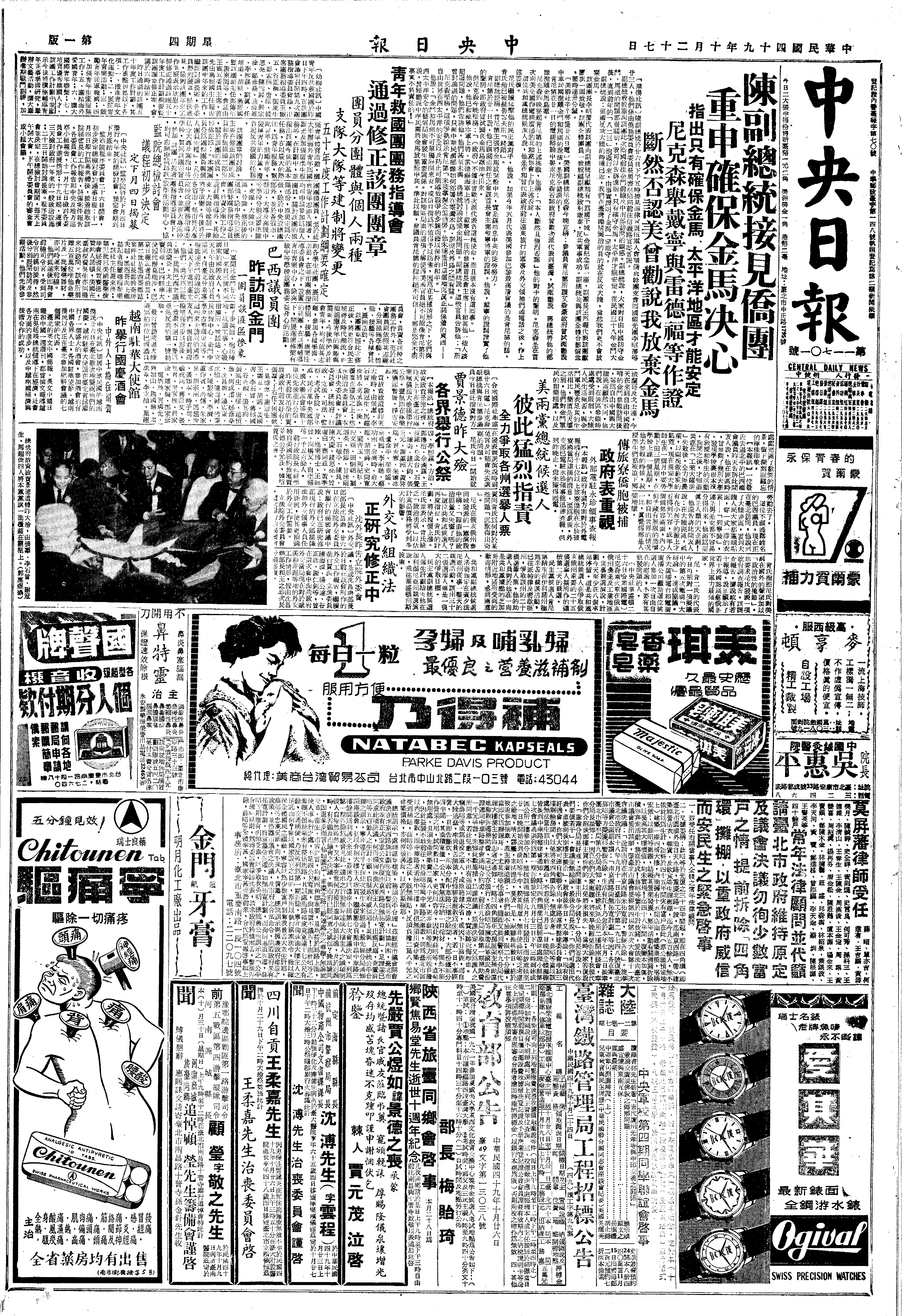 一、此次美国尼、肯二人①竞选无论胜败谁属,对于金、马之地位重要,不是其左派与亲共分子所能动摇一点上,殊于我有益也。果尔,如其民主党当政,只要其对金、马政策如旧不变,则其对我军经援助亦决不致歧视或过分削减,而且议会仍为其民主党占多数,则通过援款或反较易乎,此则对我有利之一面也。