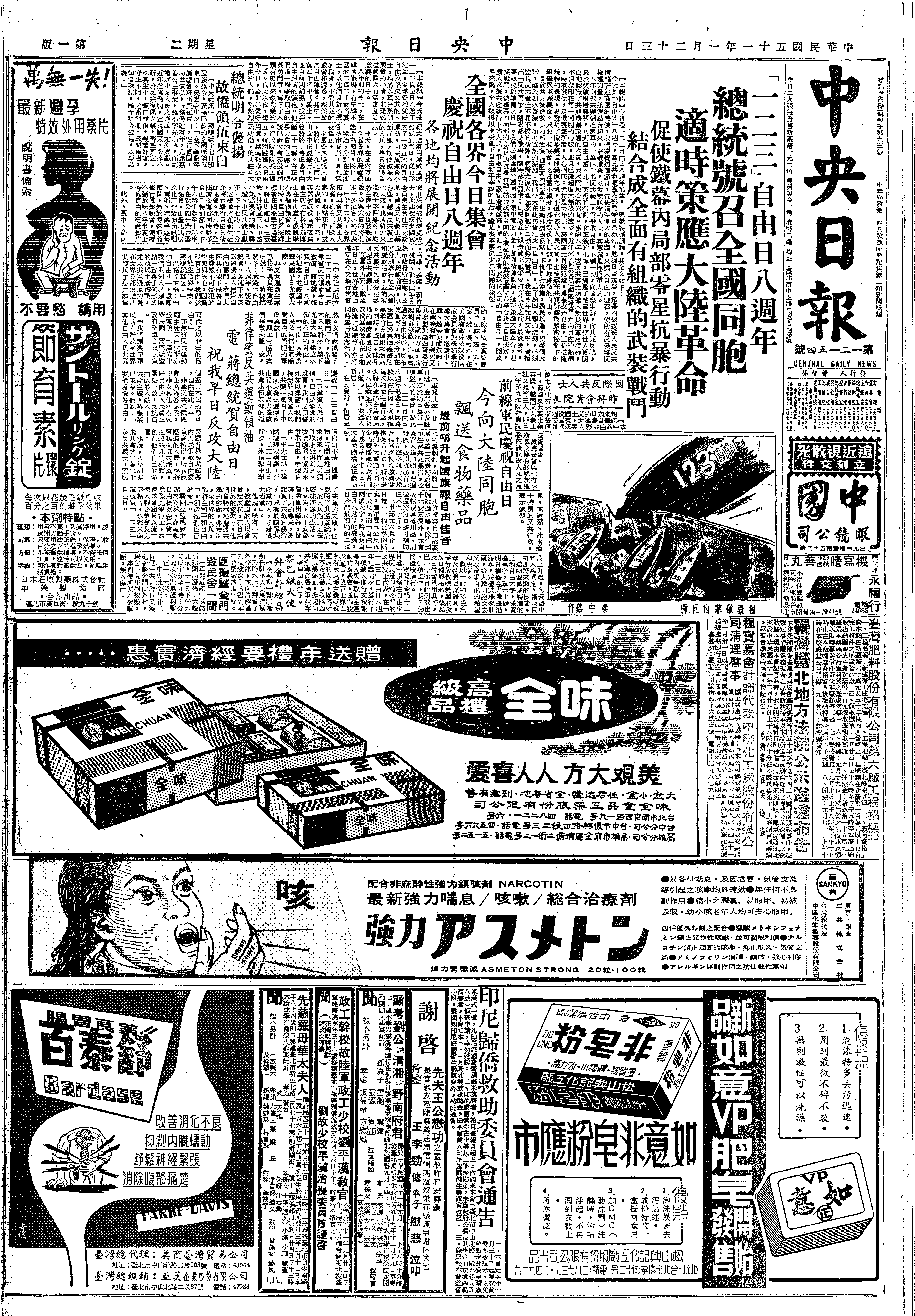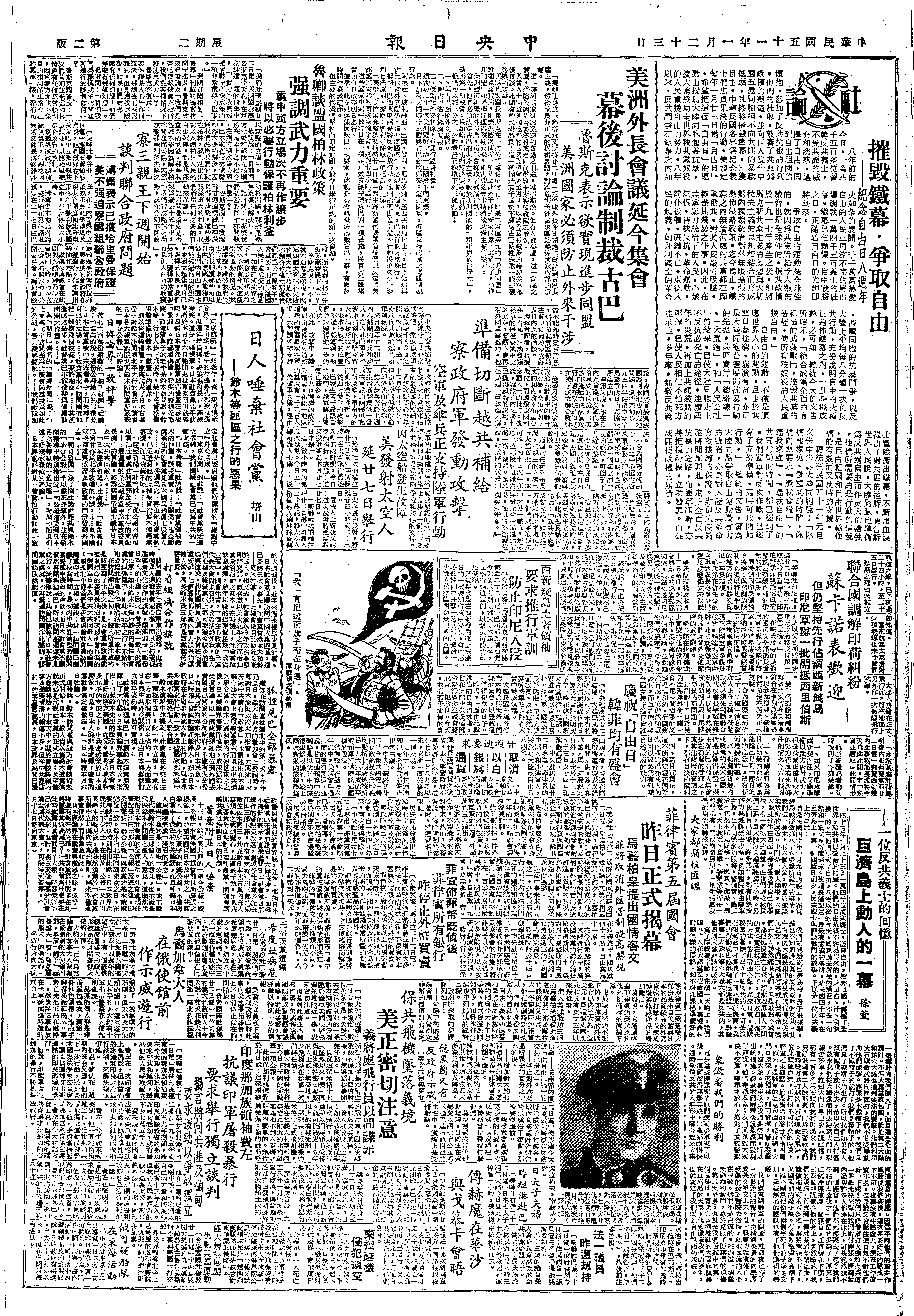 于自由日发表文告,号召全国同胞,适时策应大陆革命。
