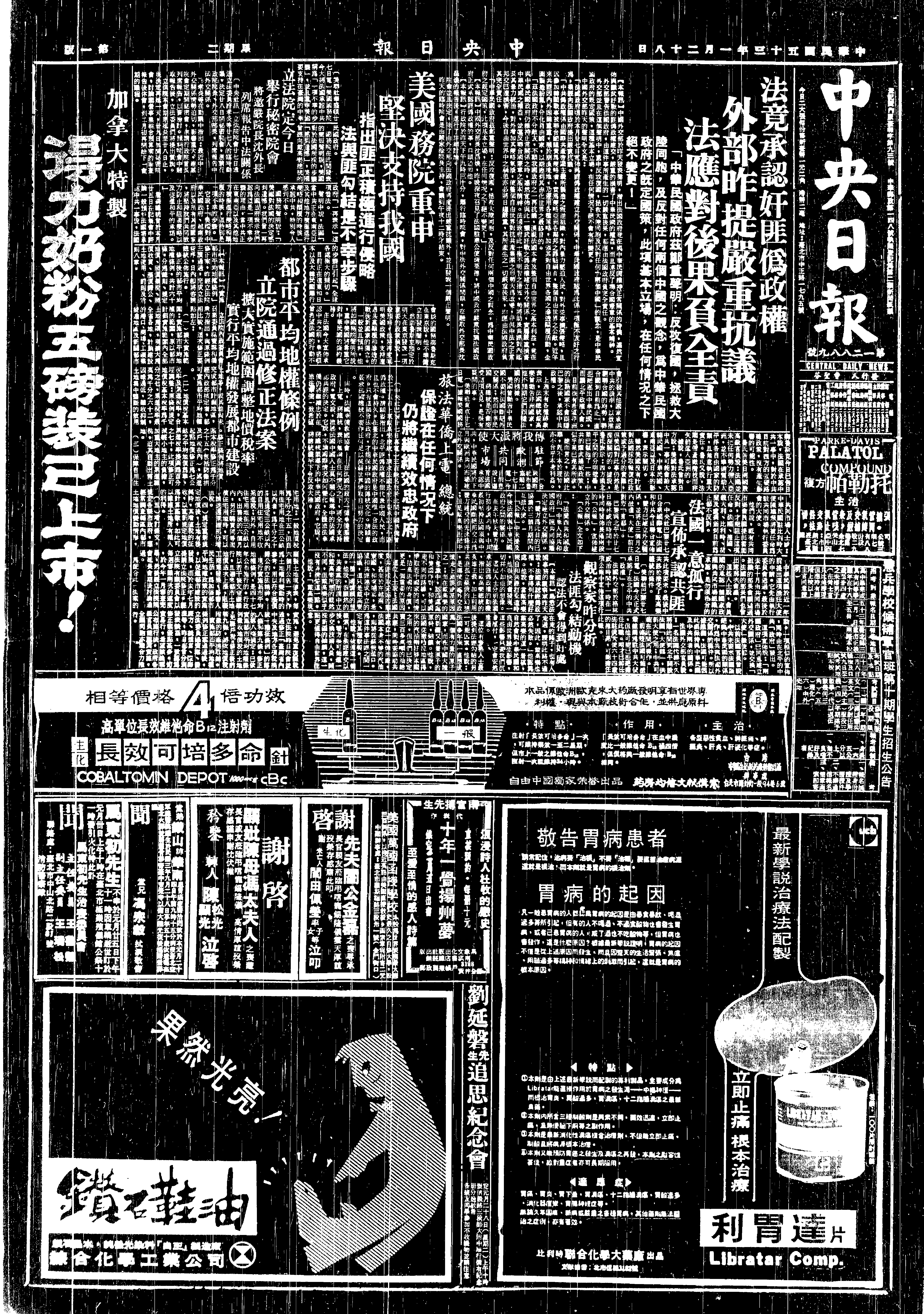 The G.R.C. 【中華民國政府] denounces French action but does not break off relations with France. The Reds issue a statement that they could not accept 2-China concept.