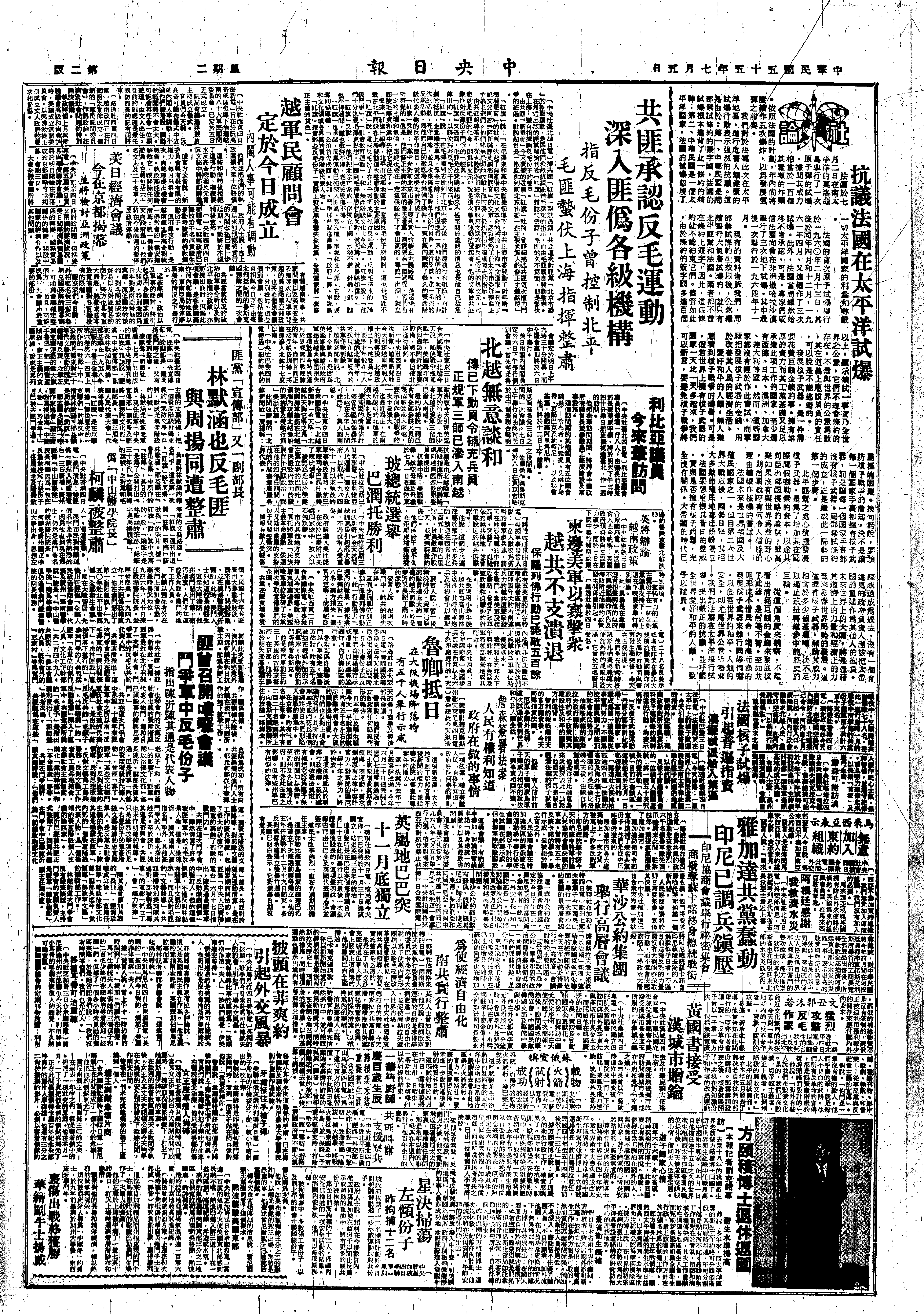 晨间广播《人民日报》社论《美帝侵略没有界线,我们反侵略也没有界线》。今日报载郭沫若在亚非作家紧急会议的发言,除了谴责美帝及苏修之外,也谈到文化大革命,并为自己4月14日在人大常委会上发言辟谣。上午大雨,赴所将抄好的第二部分检查(学术思想)交给文化革命小组,并继续修改第三部分。下午学部工作组组长张际春同志来所视察,并对全所同志讲话,阐明文化大革命的重要性及具体作法:在党的领导下,依靠左派,联合大多数群众,打击少数反党反社会主义分子及党内走资本主义道路当权派。晚间党支部开会,但两所长、两主任都不能参加。阅《历史科学中两条道路的斗争》中南开大学部分(229—323页,全书完)。这书是1958年北大、师大、南开三大学历史系大字报选辑,共计111篇,可见当年整风时对于资产阶级思想的批判,其中除了“学习苏联”一条之外,现下都仍适用,仅有些问题提得没有现下那么高,对于让步政策没有像现下这样深恶痛绝。晚间秀君的病又要发作,服药后稍轻。