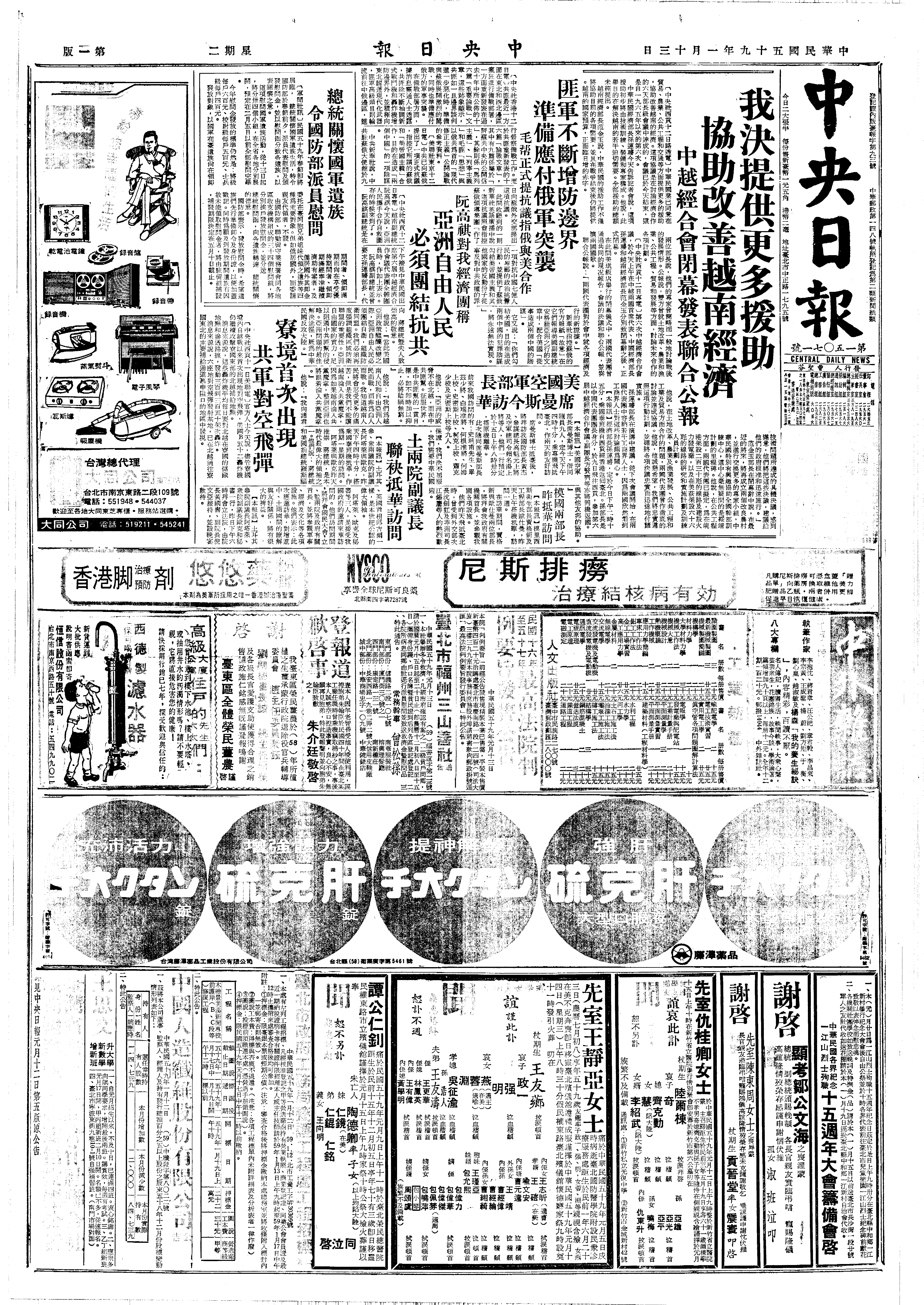蒋中正对驻日外籍记者访问团谈话,表示我捍卫自由安全一贯立场,永不改变。并忠告美国,中华民国之利,即美国之利;中华民国之不利,亦即美国之不利。