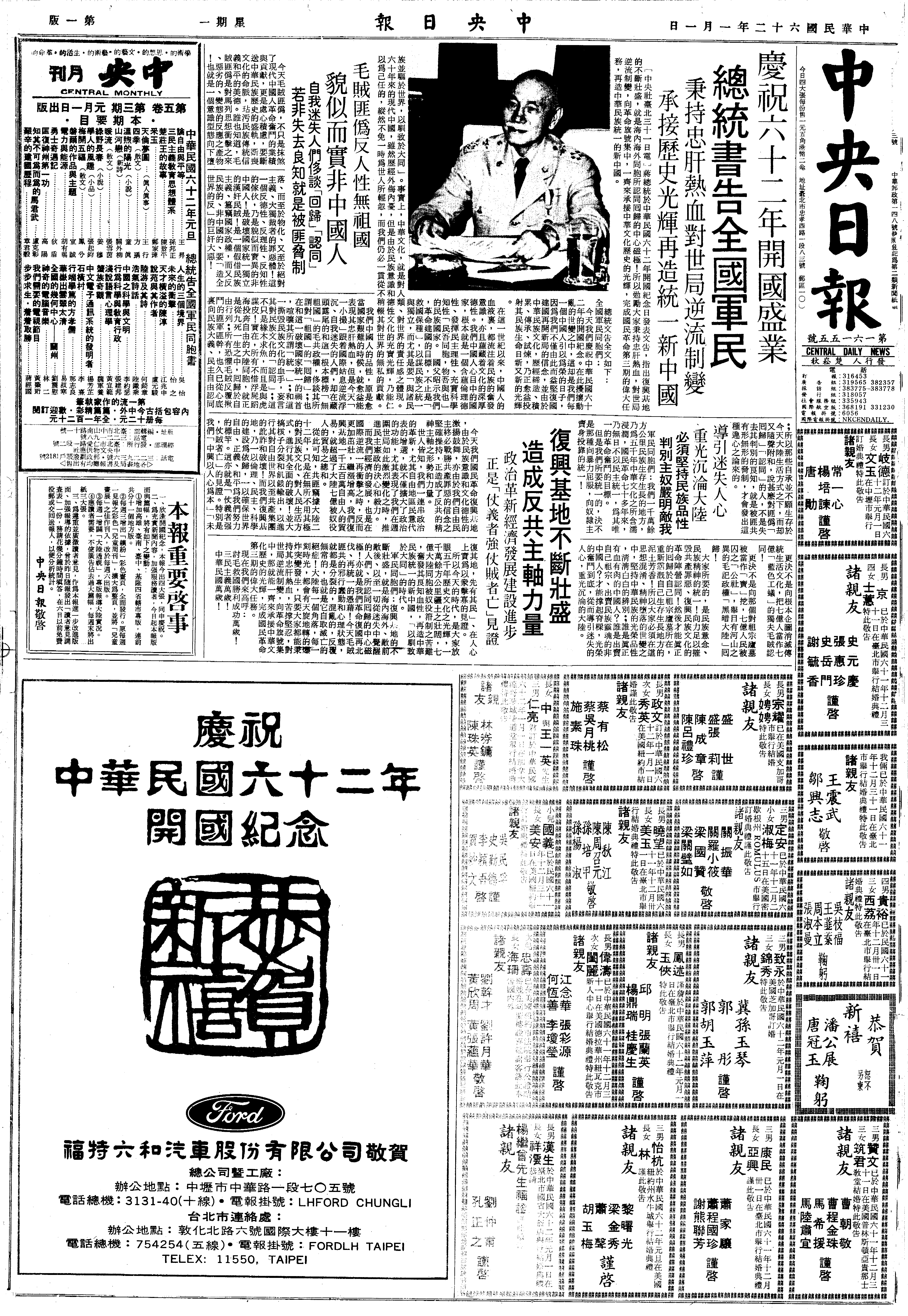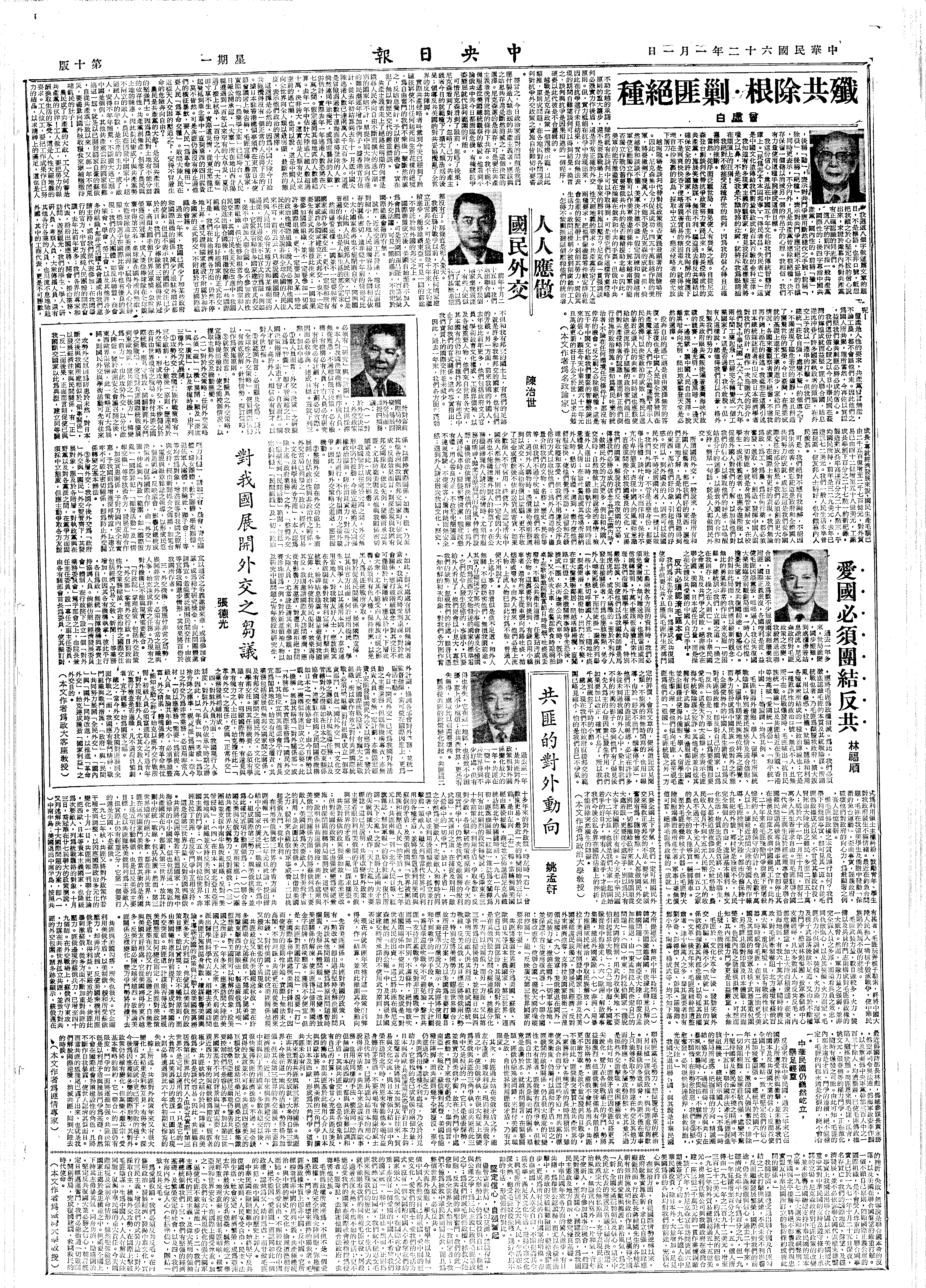 元旦书勉全国军民,秉持忠肝热血,苦撑坚忍,对世局逆流制变。并指斥毛匪反人性,无祖国,乃是貌似而实异的中国人,我必坚持民族品性,判别主奴,严明敌我。
