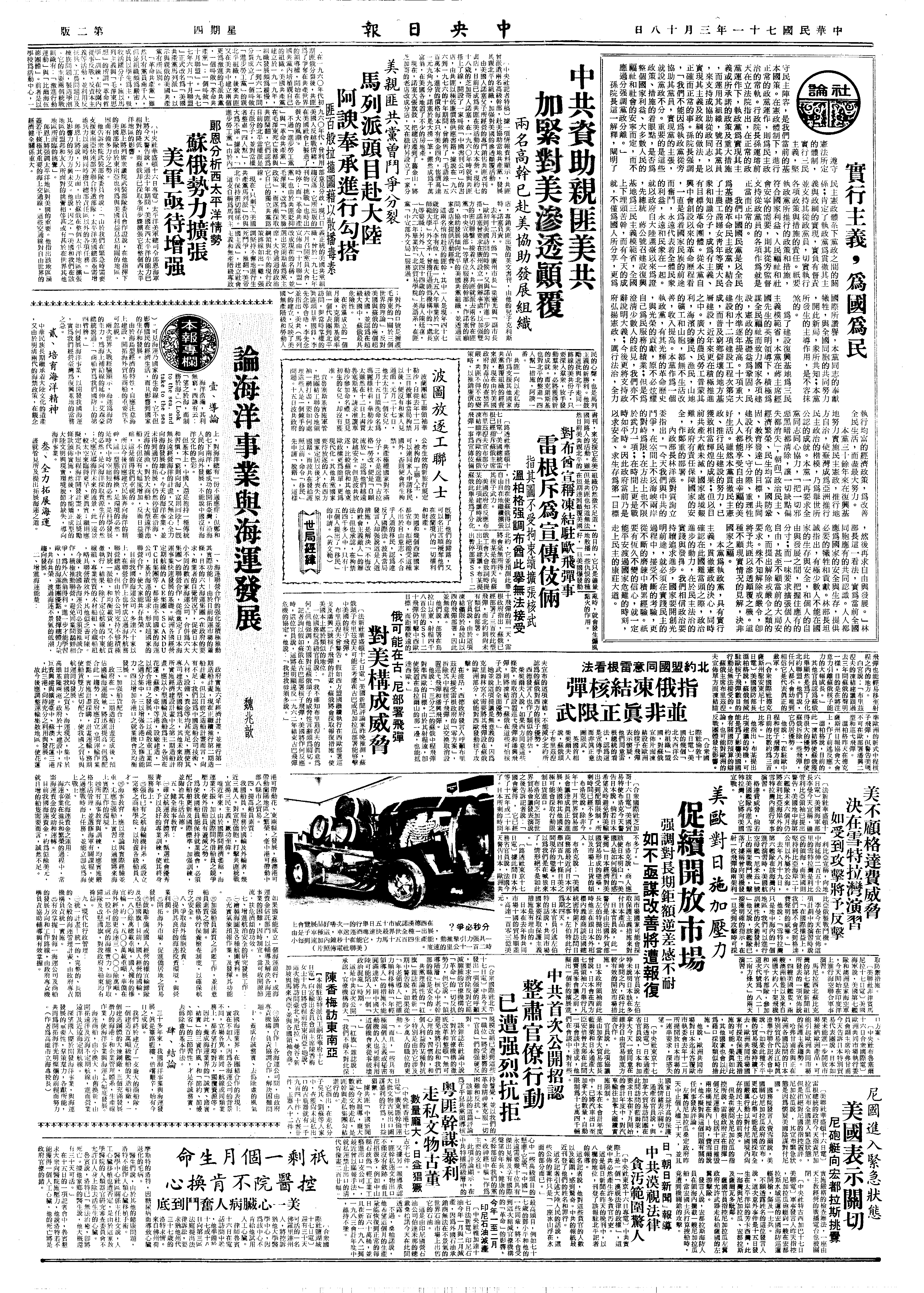 (二)针对苏联日趋增加的威胁,包括日本在内的自由世界主要国家,现在正被要求进一步加强集体防御力量。